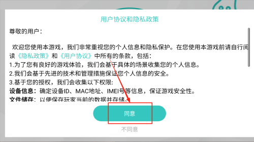 1、同意协议:在“用户协议和隐私政策”页面点击“同意”,正式进入游戏。