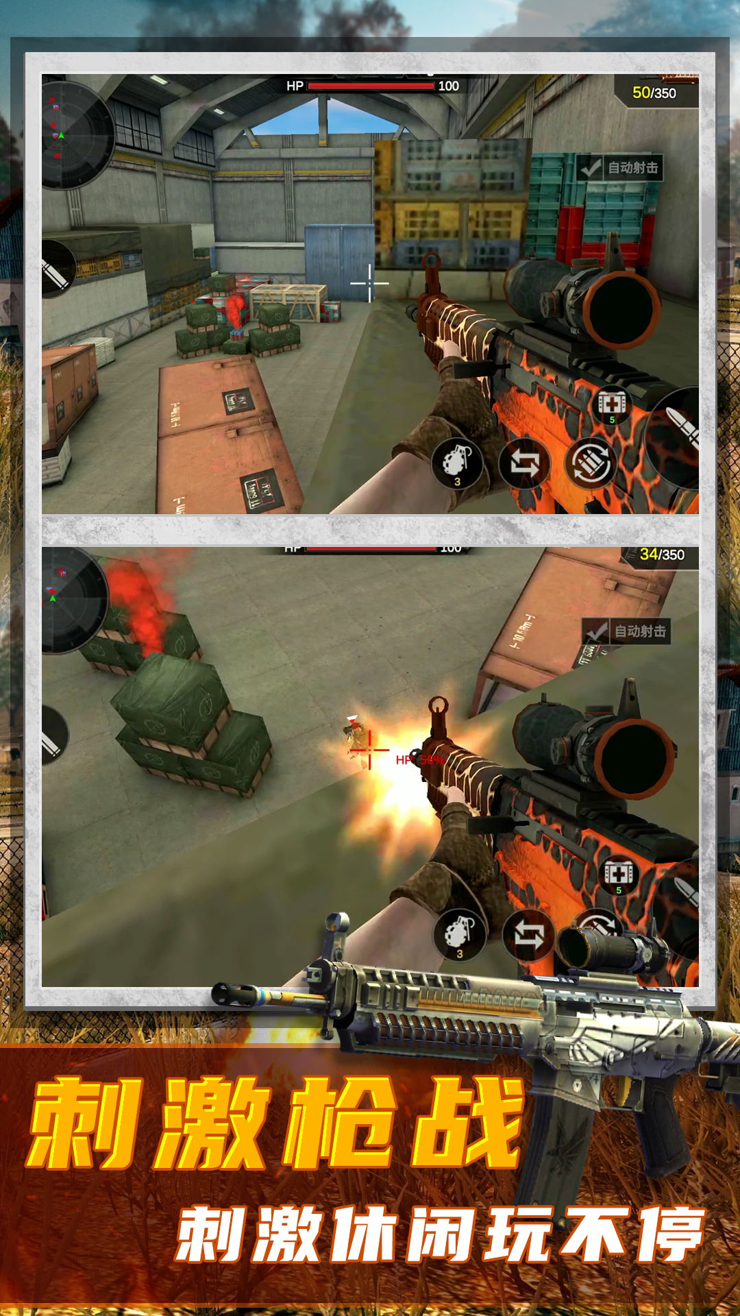 3、敌人太多了,枪战不断,让我们在这里英勇战斗,消灭敌人,赢得胜利。