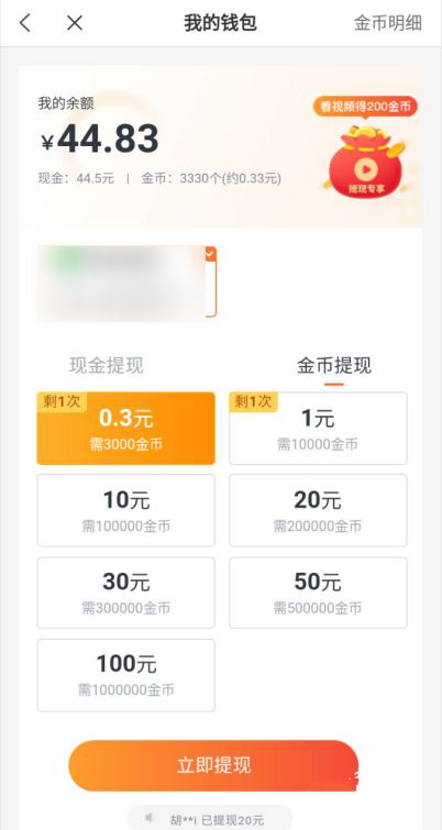 点击右侧的金币提现,选择提现金额-----立即提现。