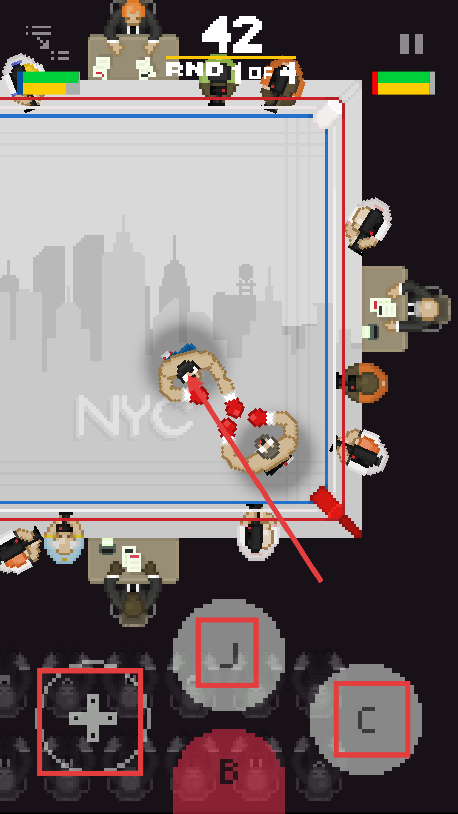 2、战斗中操控虚拟【十字方向键】移动,按【J键】出拳攻击,【C键】释放特殊技能,在纽约背景拳台上躲避对手攻势并主动反击。
