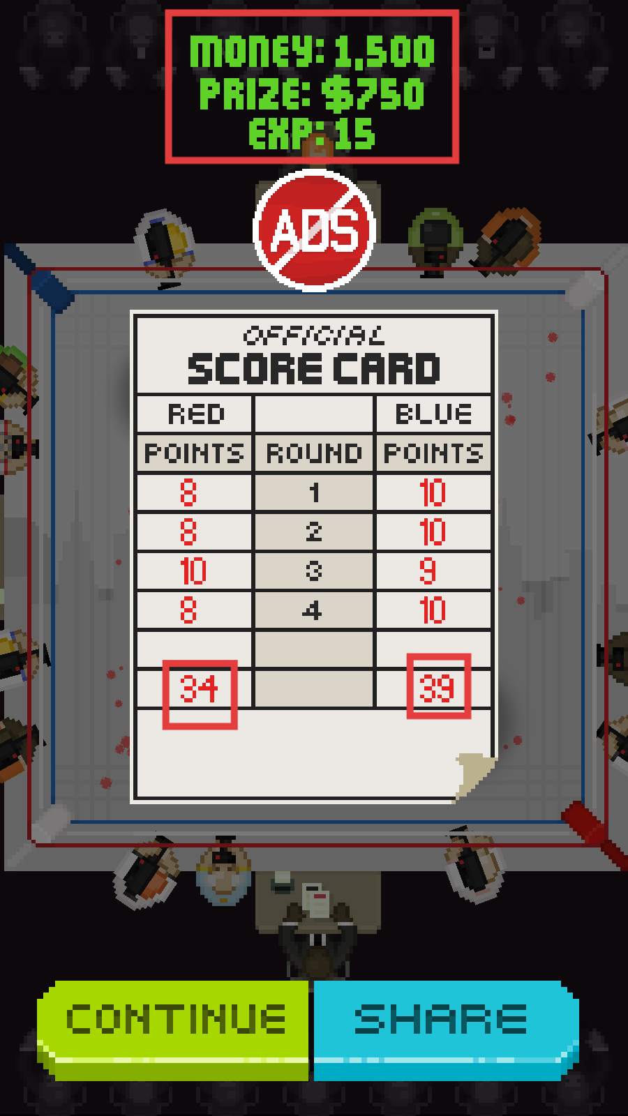 4、战斗结束后查看【计分卡】,本次RED方得34分、BLUE方得39分,领取【money:1,500】【prize:$750】【exp:15】奖励。