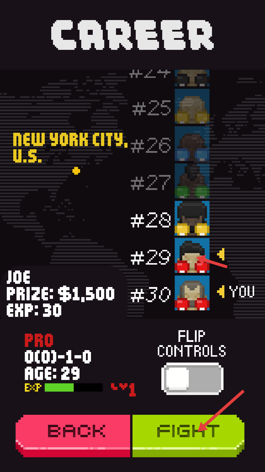 1、在【CAREER-职业模式】界面,选择对手【#29】,角色【JOE】奖金$1500、经验30,点击绿色【FIGHT】按钮开启格斗挑战。
