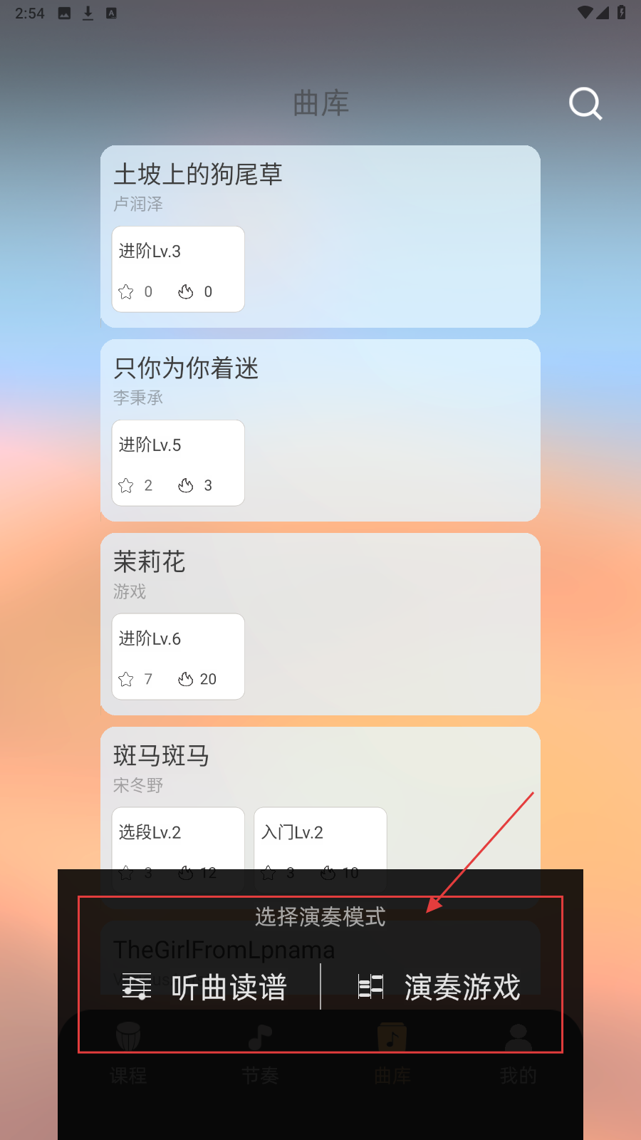 1、进入【曲库】页面选曲,如【土坡上的狗尾草】,查看难度等信息,挑适配曲目练习。