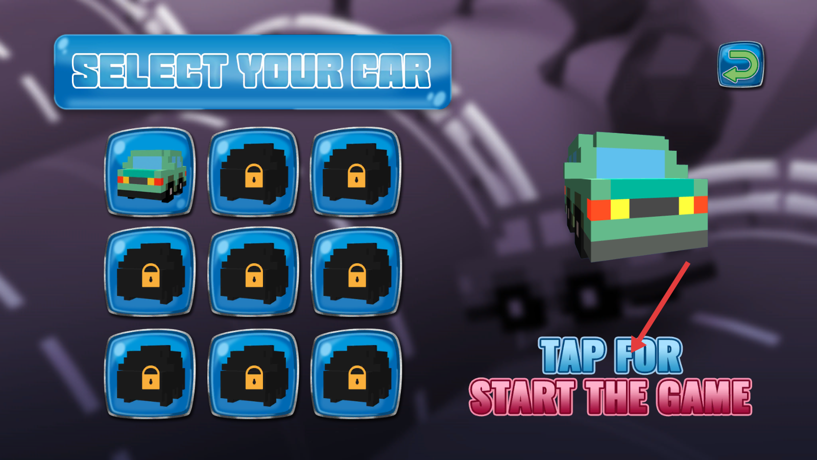 1、进入游戏先选解锁车辆,点击【TAP-FOR-START-THE-GAME】,开启公路竞速的挑战之旅。