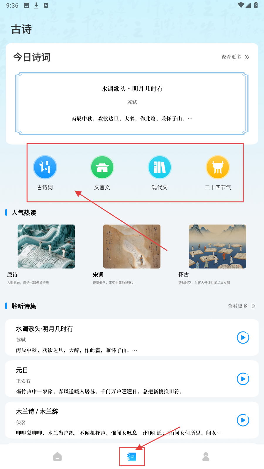 1、打开应用,在【古诗】页面,有古诗词、文言文等分类,选择想进行学习的类型,如点击【古诗词】。