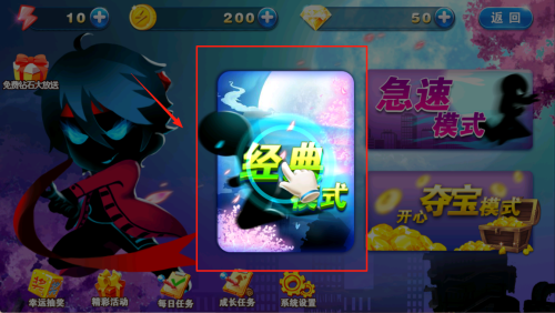 1、选择模式:在主界面点击“经典”或“急速”模式后,再按“返回”确认。
