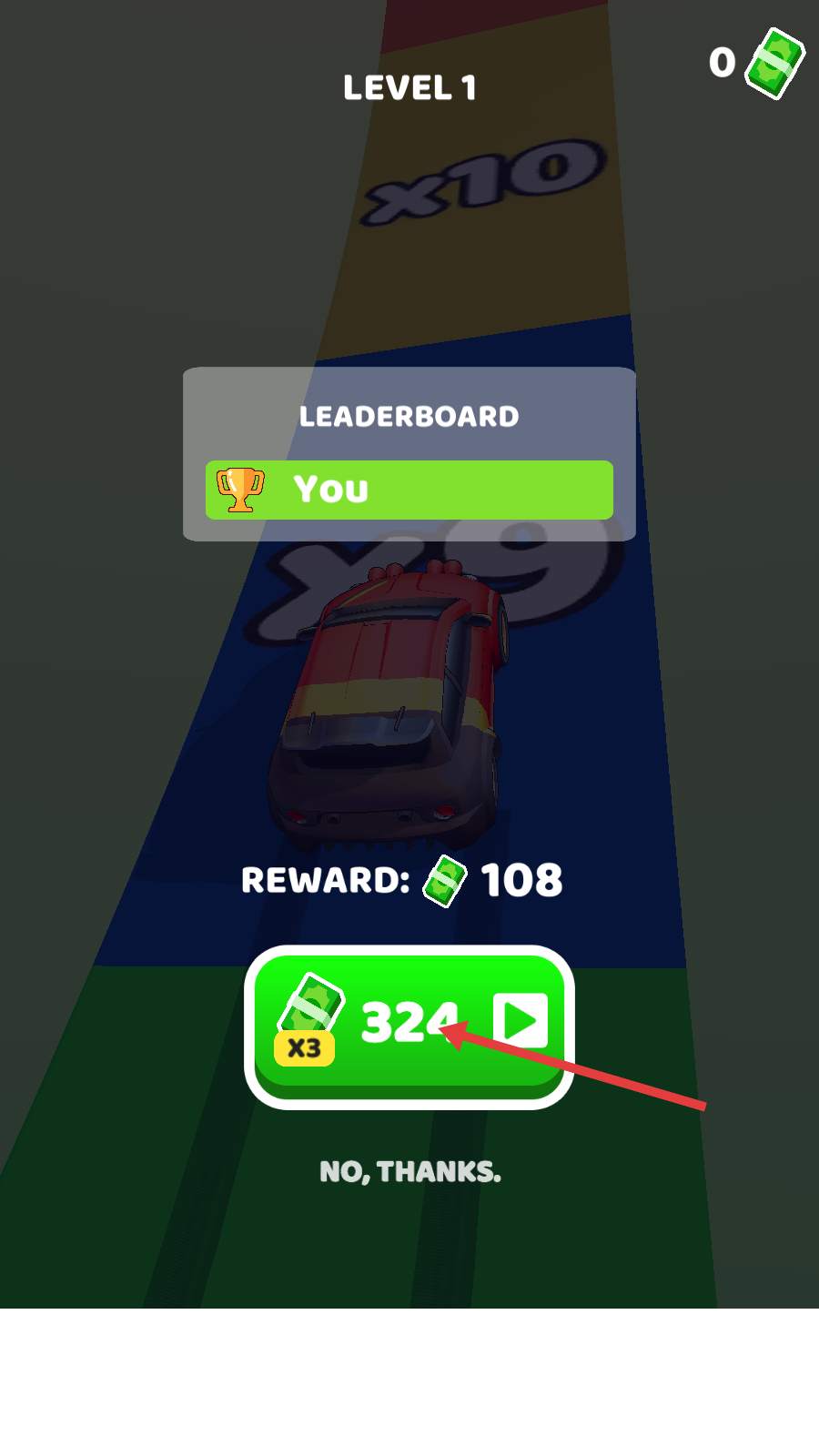 4、结算获【108】奖励,若想翻倍可点【324-x3】看广告,积累金币用于赛车强化。