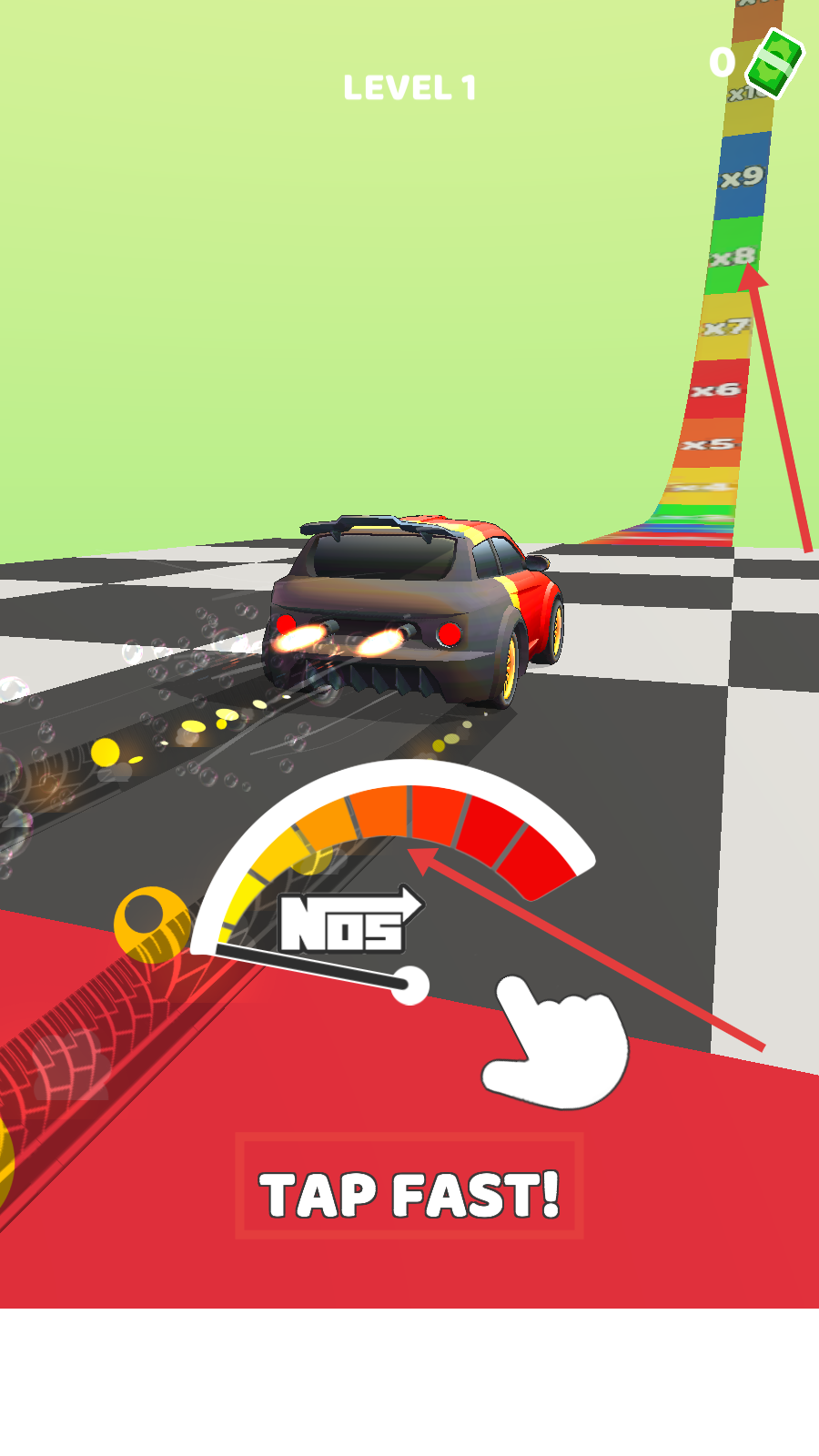 3、冲刺时猛点【TAP-FAST!】触发【NOS】加速,利用赛道倍数(x8/x9)大幅提升最终得分。