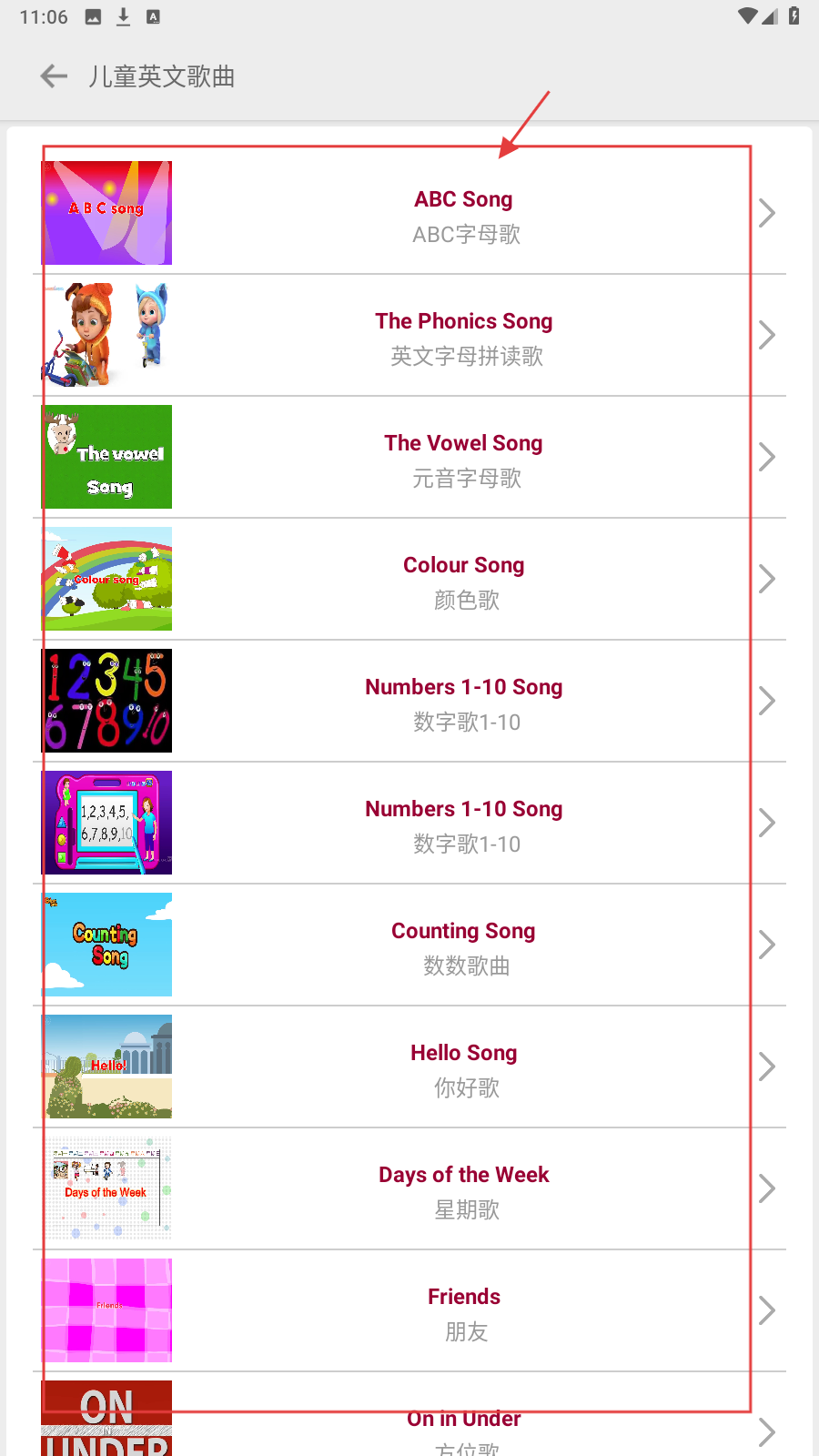 3、进入【儿童英文歌曲】页面,选择想听的歌曲,点击进入。