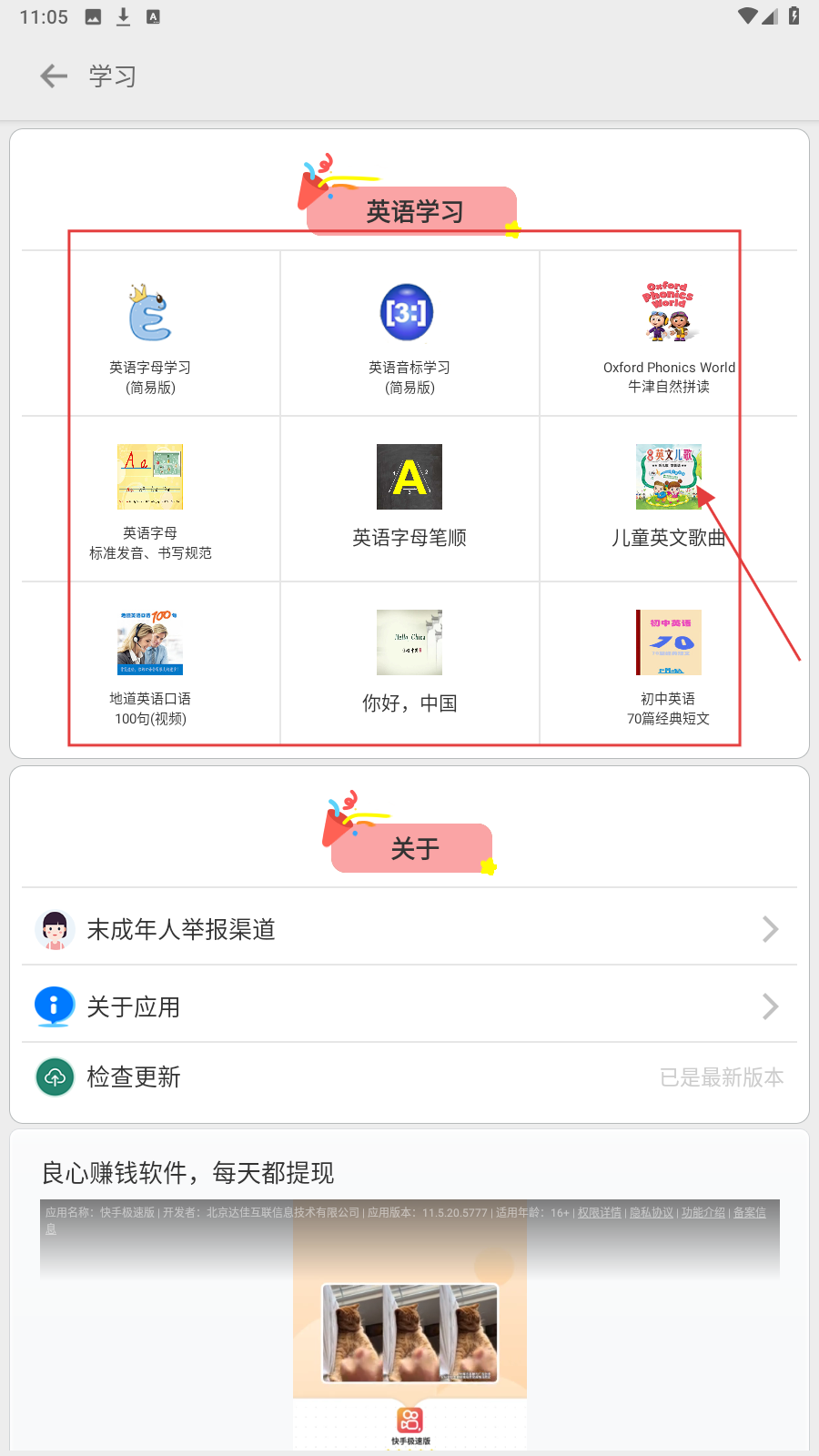 2、进入功能菜单页面,在【英语学习】板块下,选择要学习的课程类型并点击,如点击【儿童英文歌曲】。