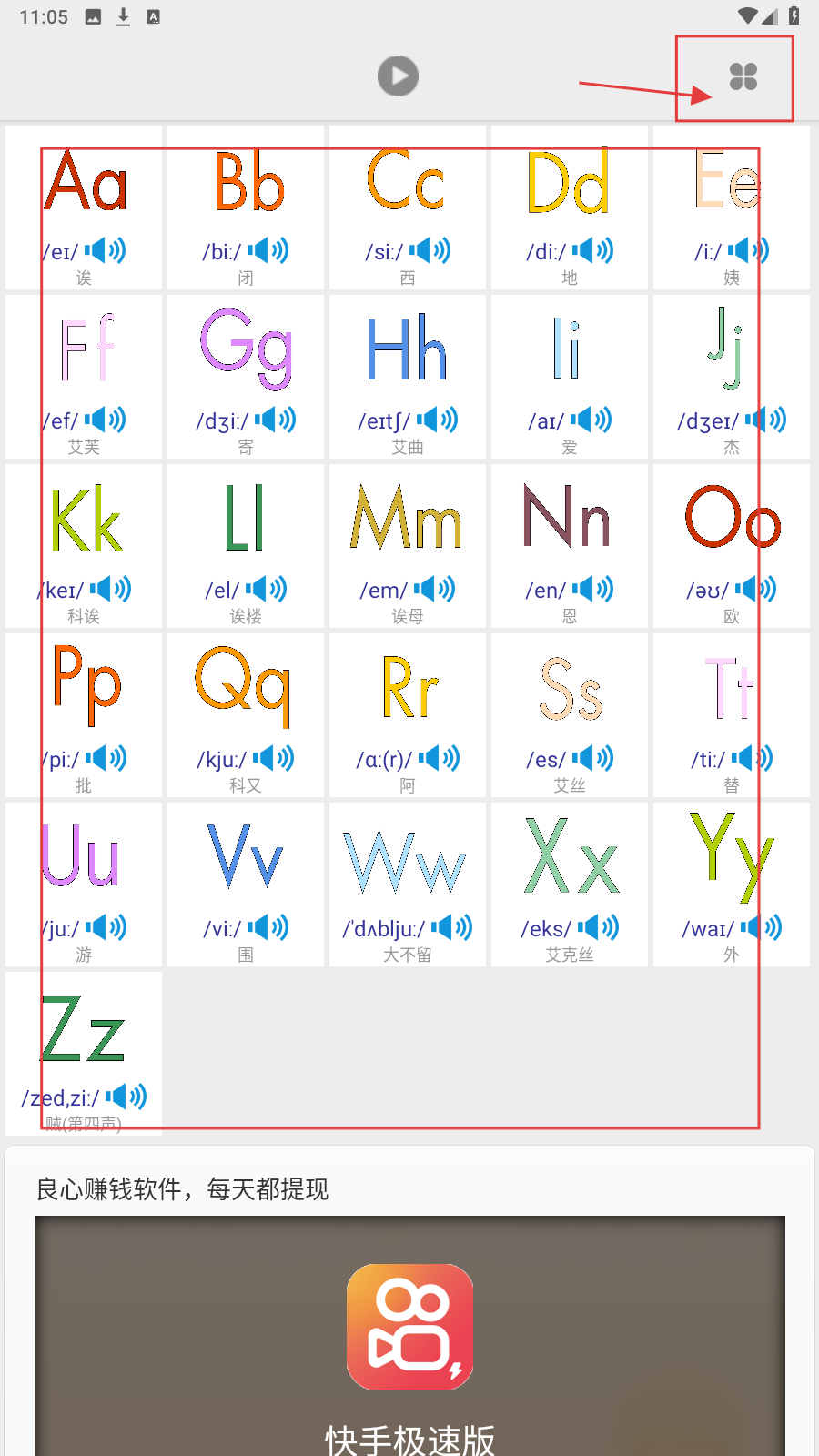 1、打开应用,在主界面有24个英文字母可以进行学习,点击右上角图标。