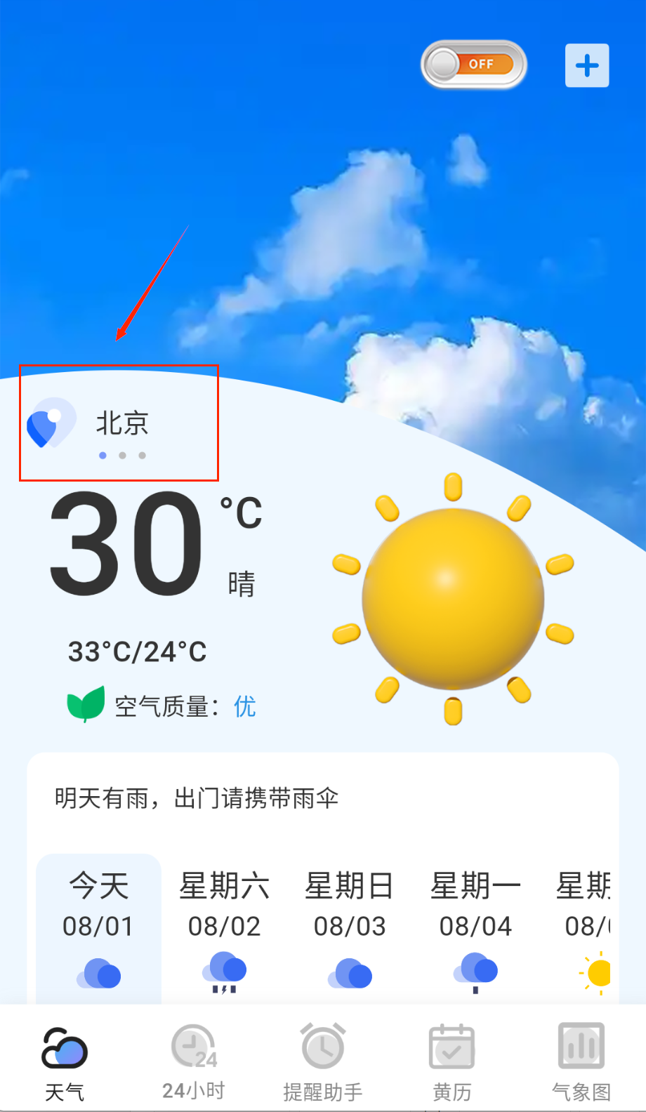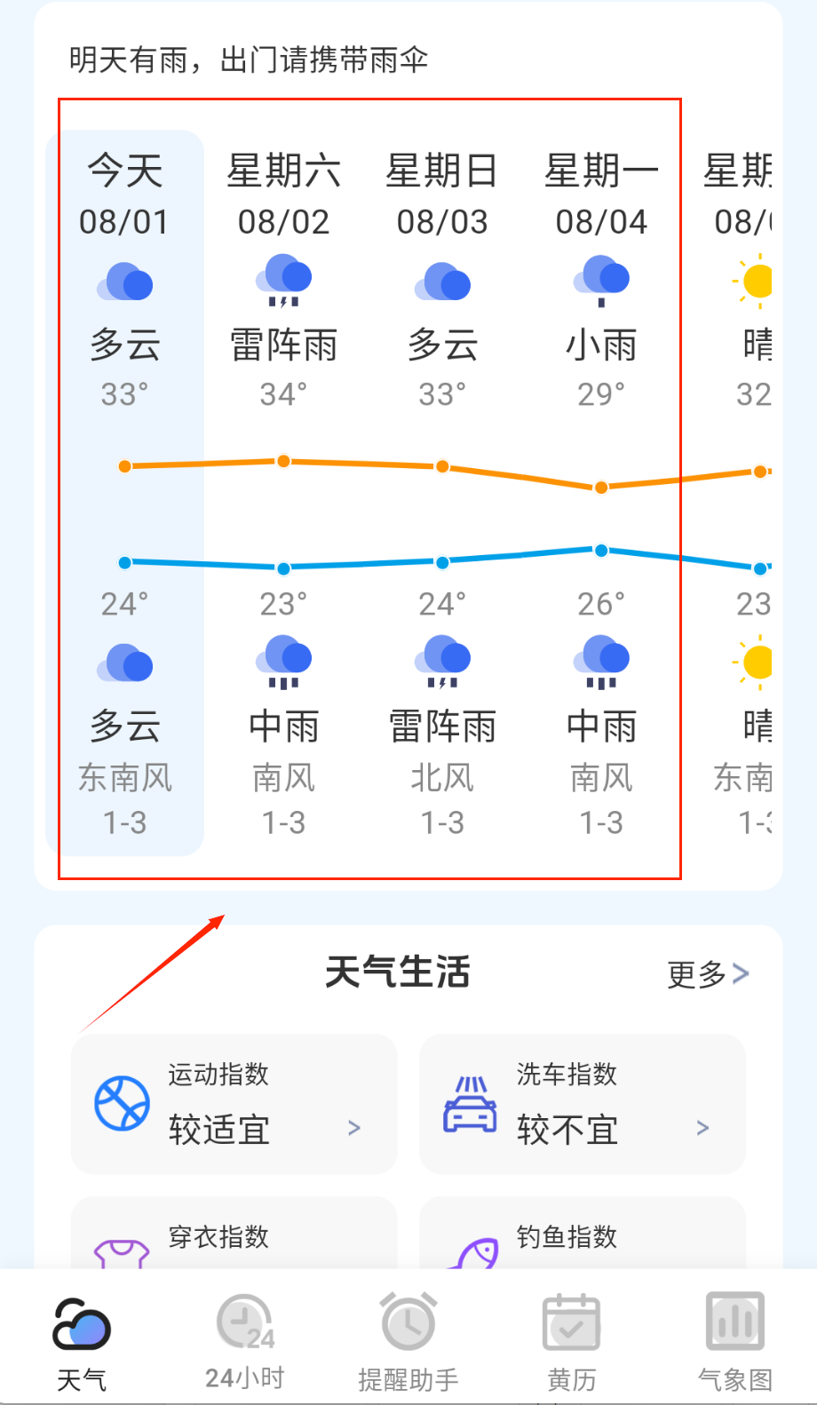 1、首次打开APP会自动获取当前位置天气信息,向上滑动可查看未来24小时详细预报数据,包括温度、降水概率和风速变化呀。