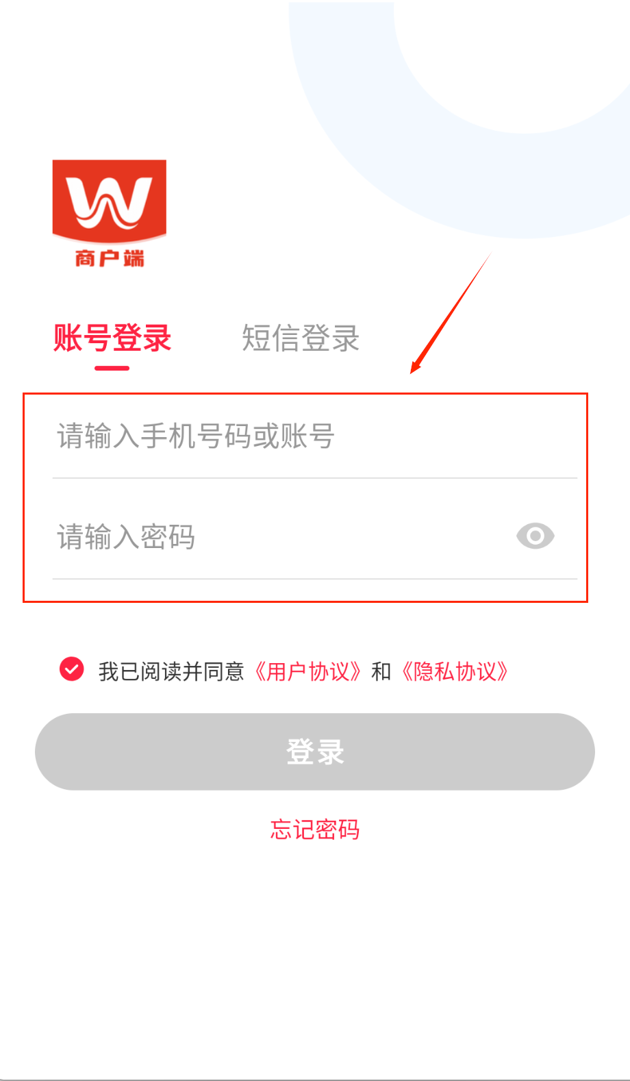 1、打开APP进入登录页,顶部显示"商户端"标识,选择账号或短信登录方式呀。账号登录需输入注册手机号和密码哦。