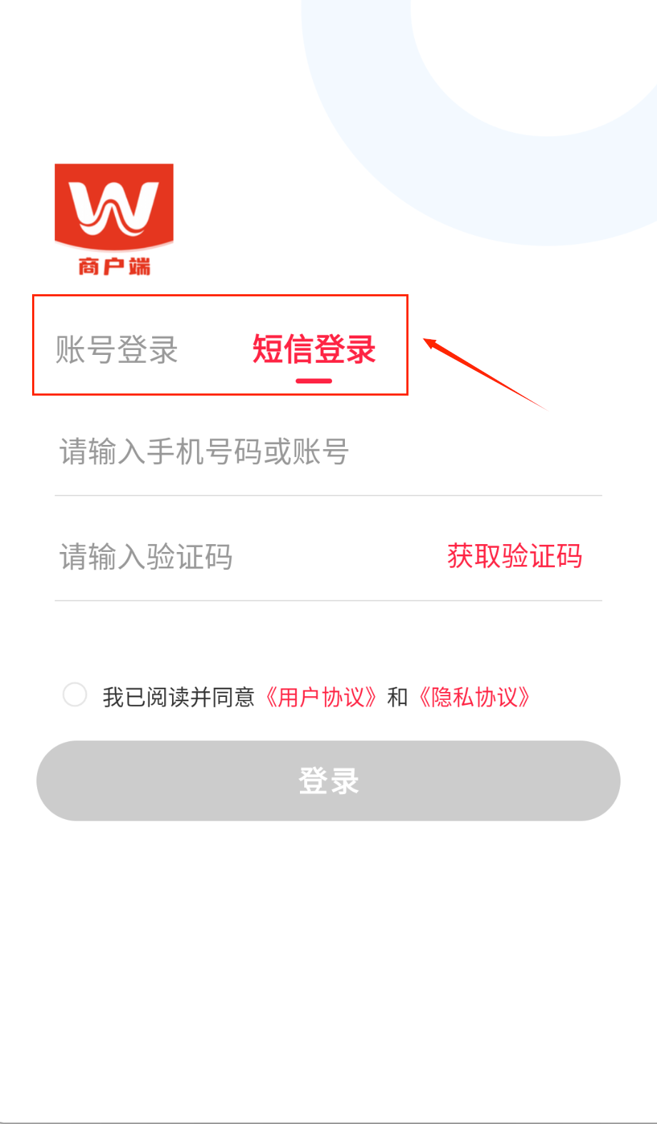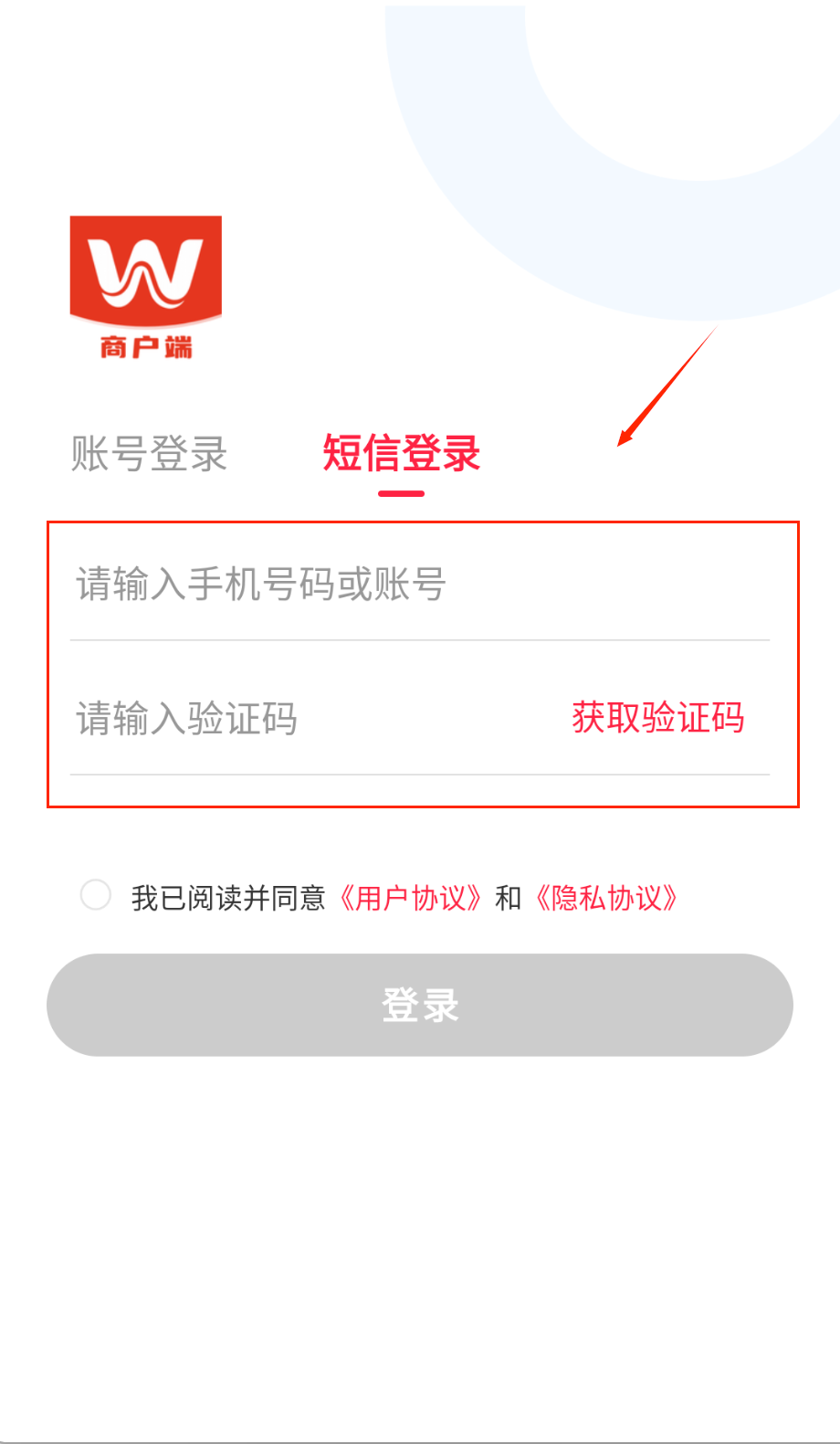 2、短信登录要先输入手机号获取验证码,收到后填入对应位置呀。两种方式都需勾选同意用户协议啦。