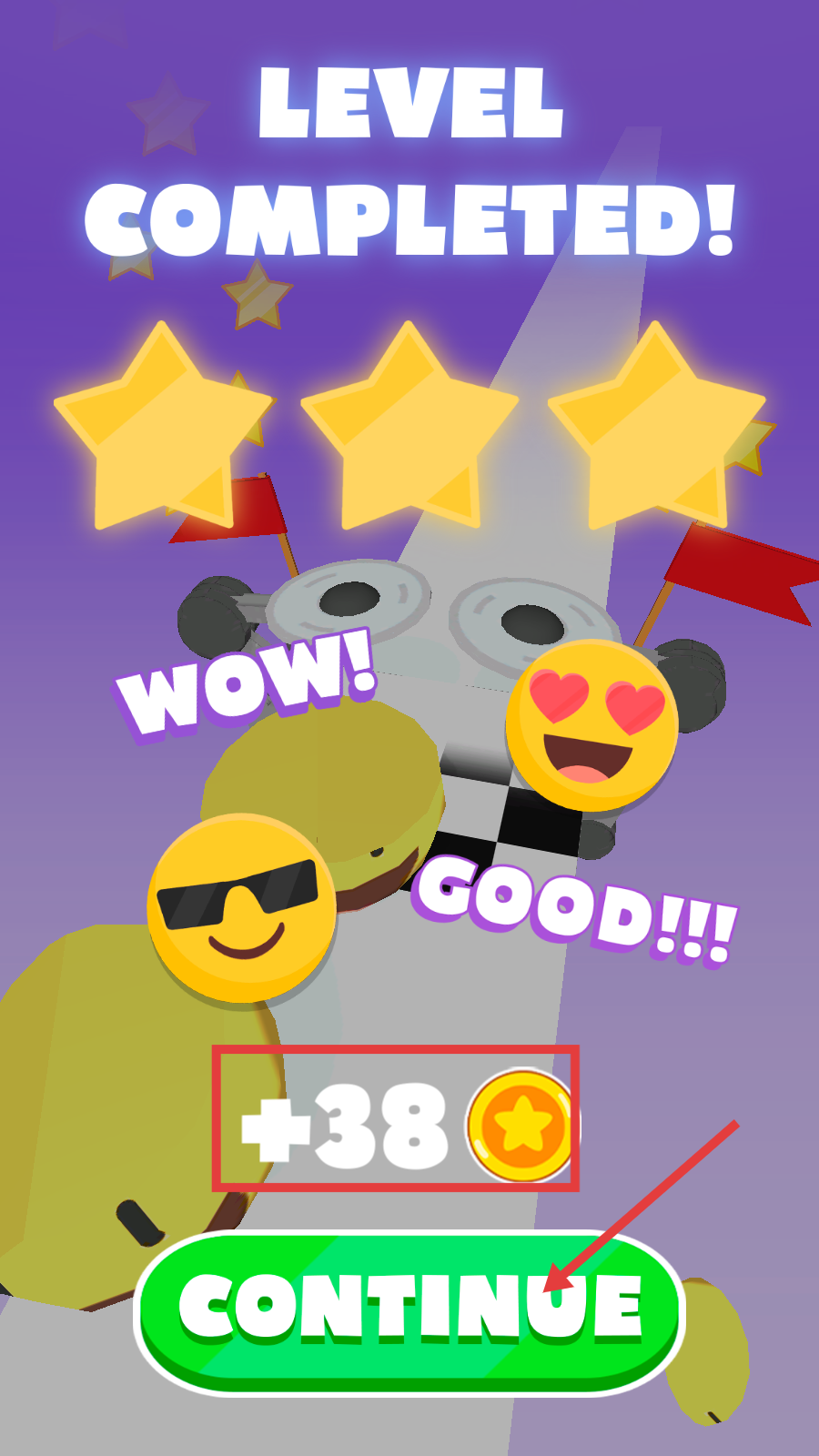 4、通关获得【 38-金币】奖励,点击绿色【CONTINUE】按钮,继续挑战下一关积累资源。