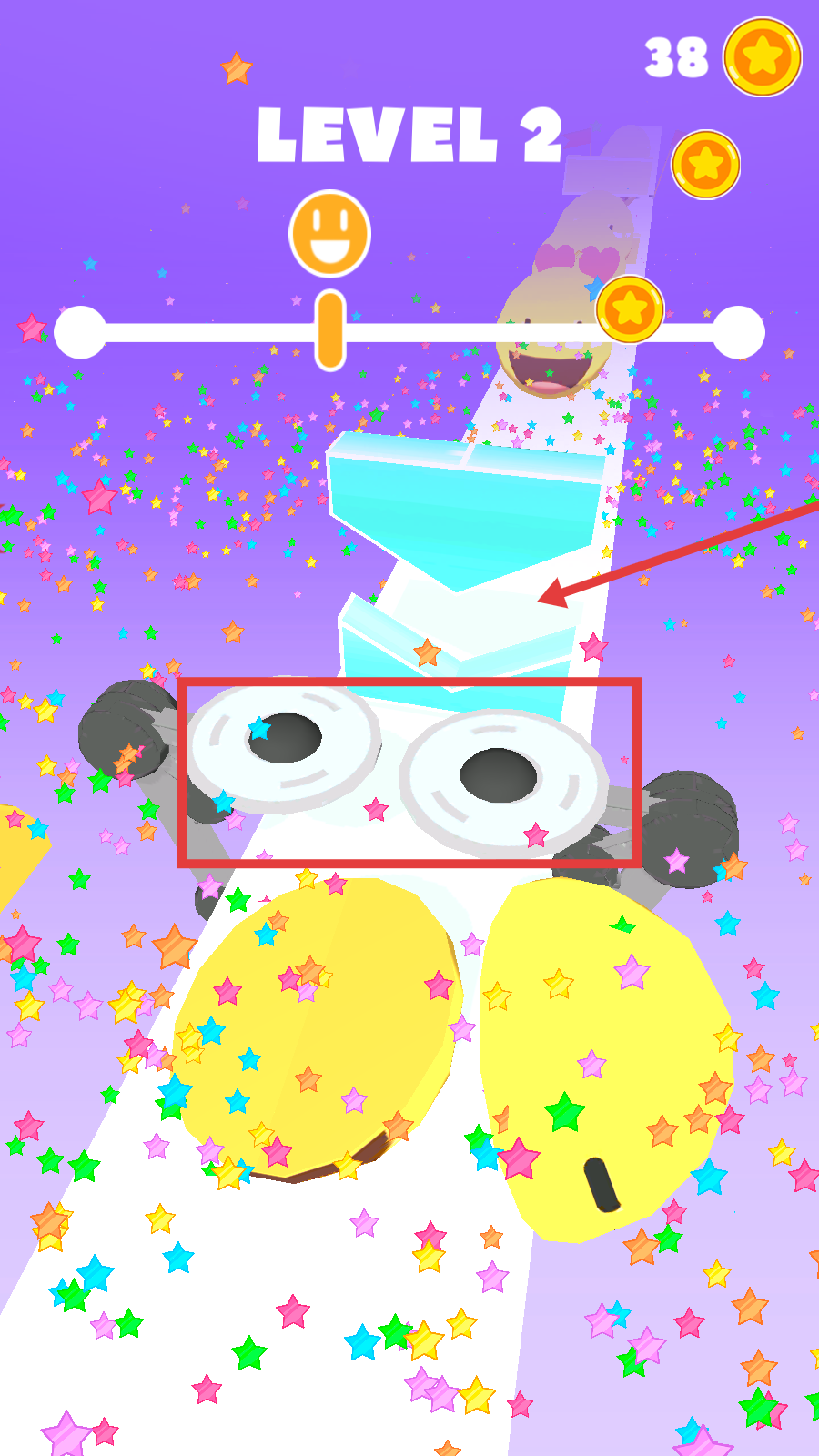 2、瞄准带白色虚线的【笑脸物体】发起切割,推进上方进度条,积累关卡完成度。