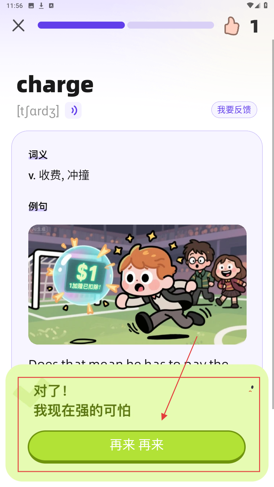 4、答对后点【再来再来】,重复挑战巩固词汇,提升学习效果。