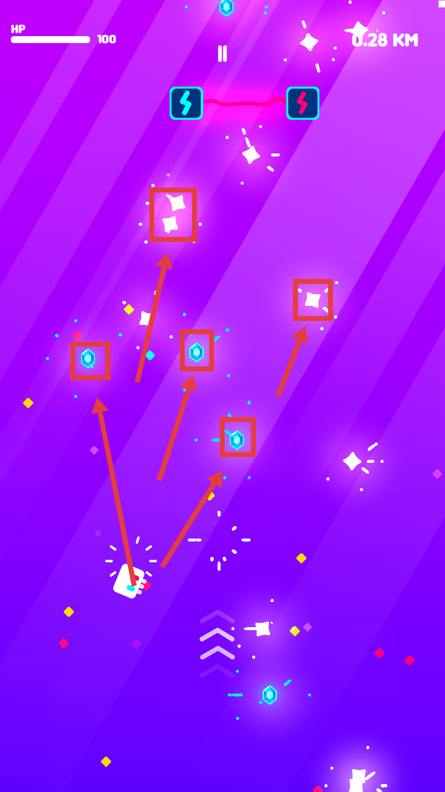 3、聚焦路径上的【白色碎片】与【蓝色晶体】,收集后推进至【0.28-KM】,借助闪电元素强化能力。