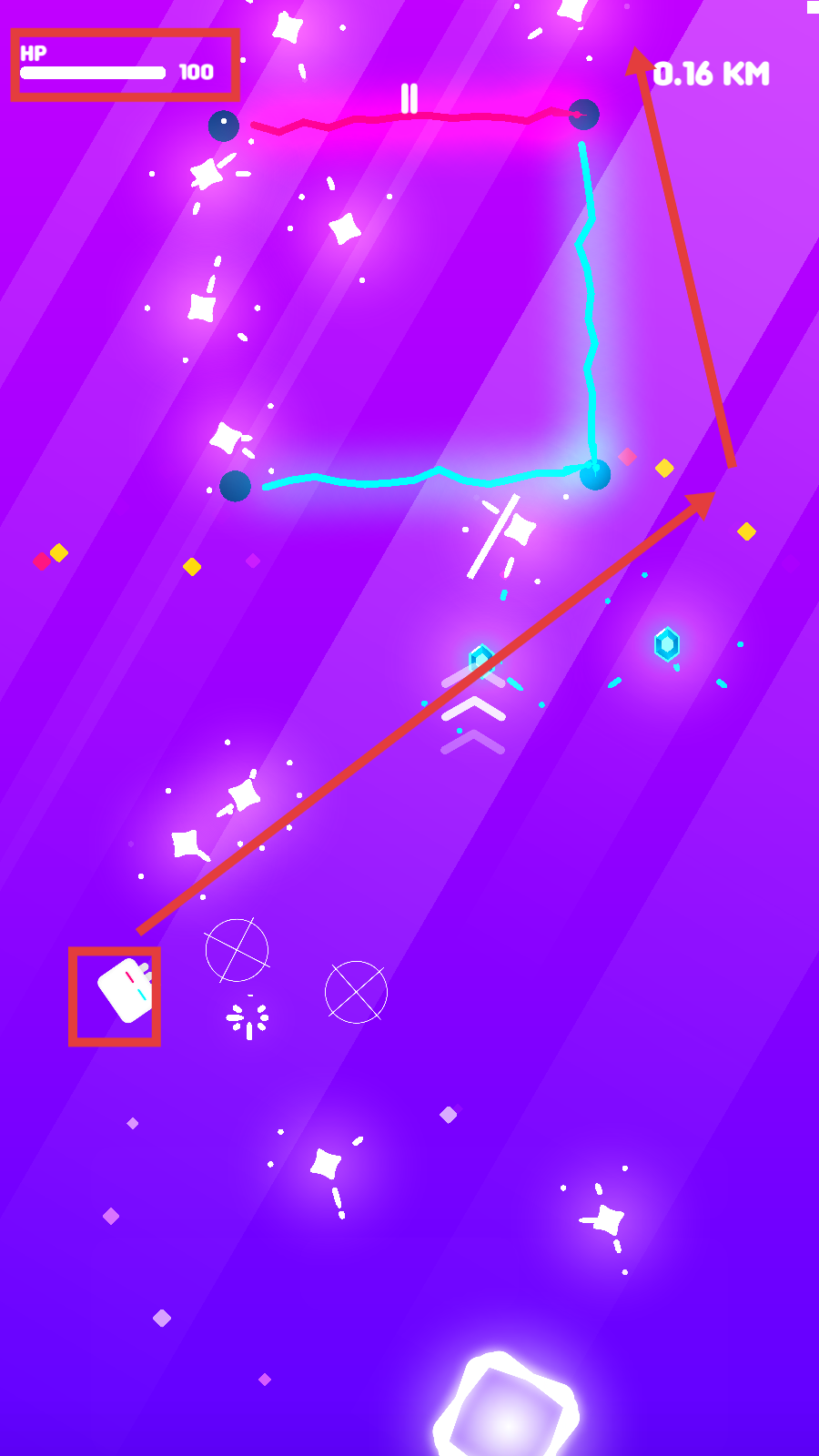 2、关注左上角【HP-100】状态,利用道具推进至【0.16-KM】,沿途收集闪烁资源提升关卡进度。