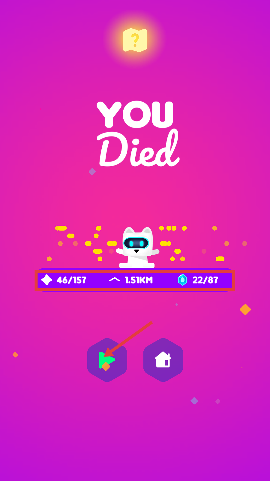 4、失败后点击绿色重试按钮,基于收集的【46/157-钻石】与【22/87-晶体】,再次挑战突破【1.51-KM】。