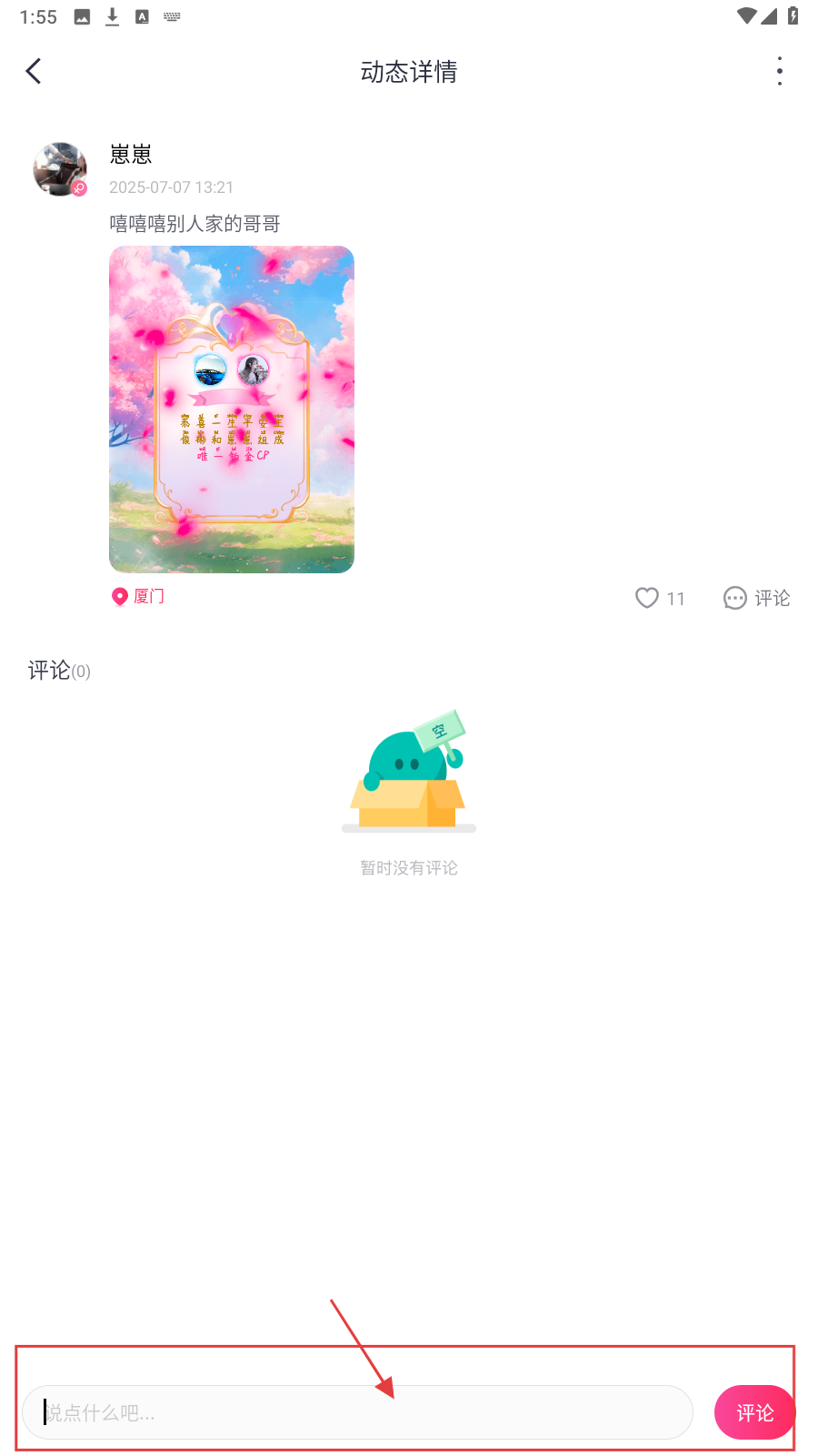 2、在动态详情页,点底部输入框,输入想说的话,参与评论交流。