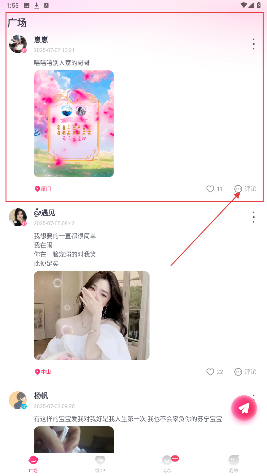 1、在广场页,查看用户动态,点【评论】,进入评论互动环节。