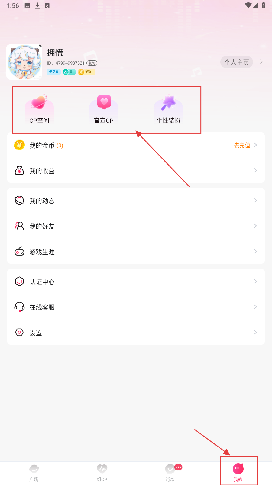 4、点底部【我的】,进入个人页,可使用【CP空间】【官宣CP】【个性装扮】等功能。