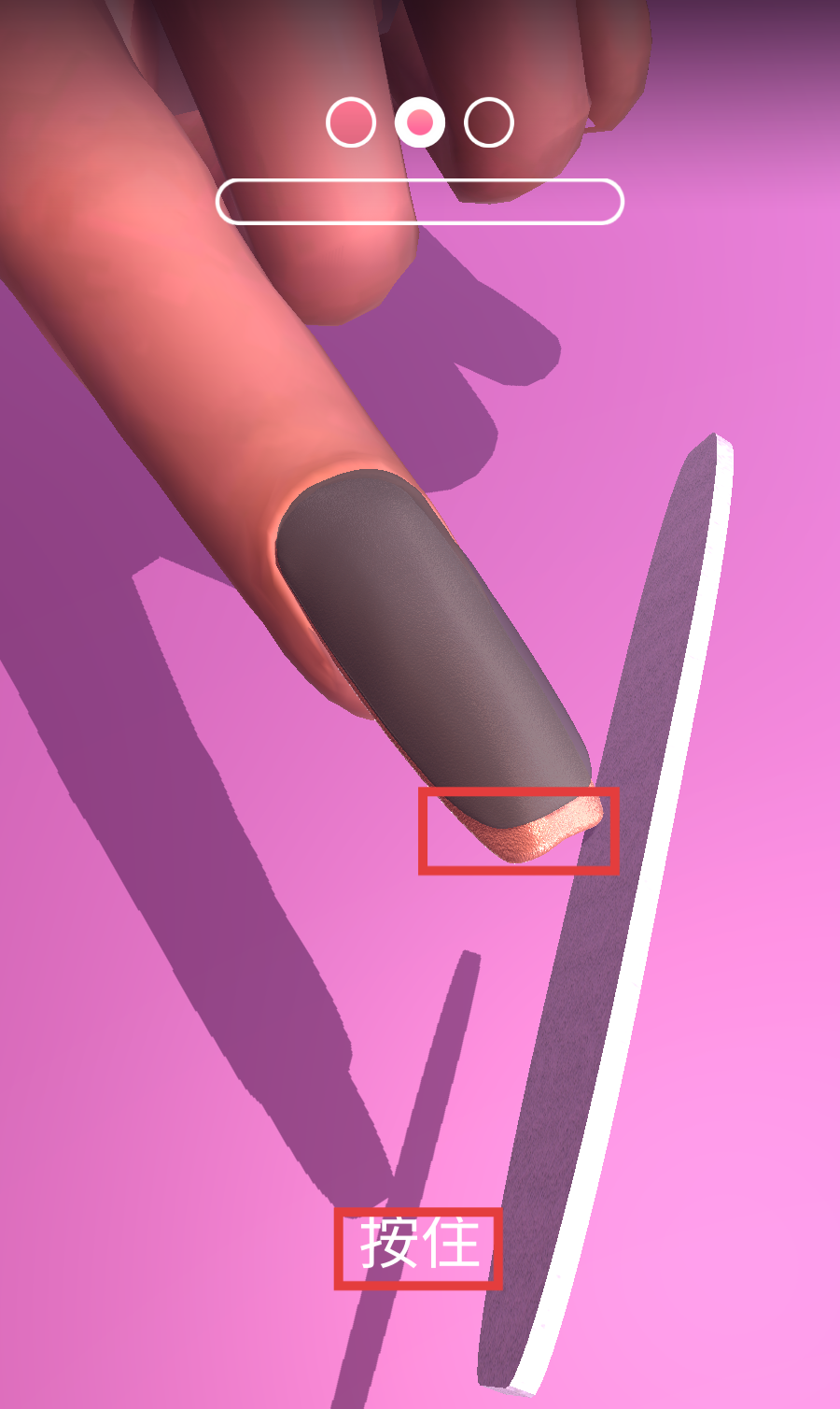 3、看到指甲锉工具时,执行【按住】操作,打磨指甲边缘处的闪粉,让边缘更整齐。