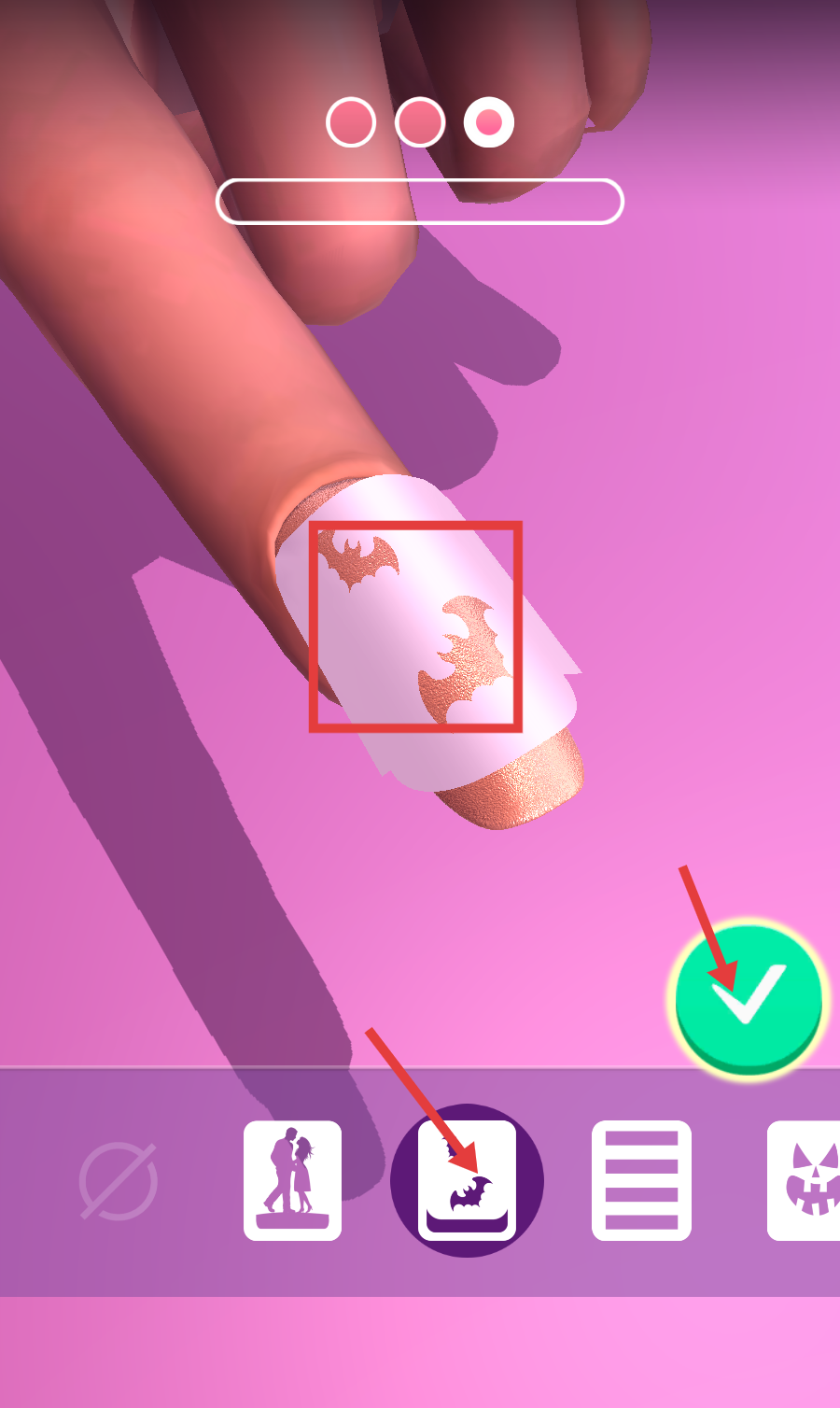 4、选择【蝙蝠】图案贴在指甲上,调整位置后点击绿色对勾,完成该阶段美甲装饰。