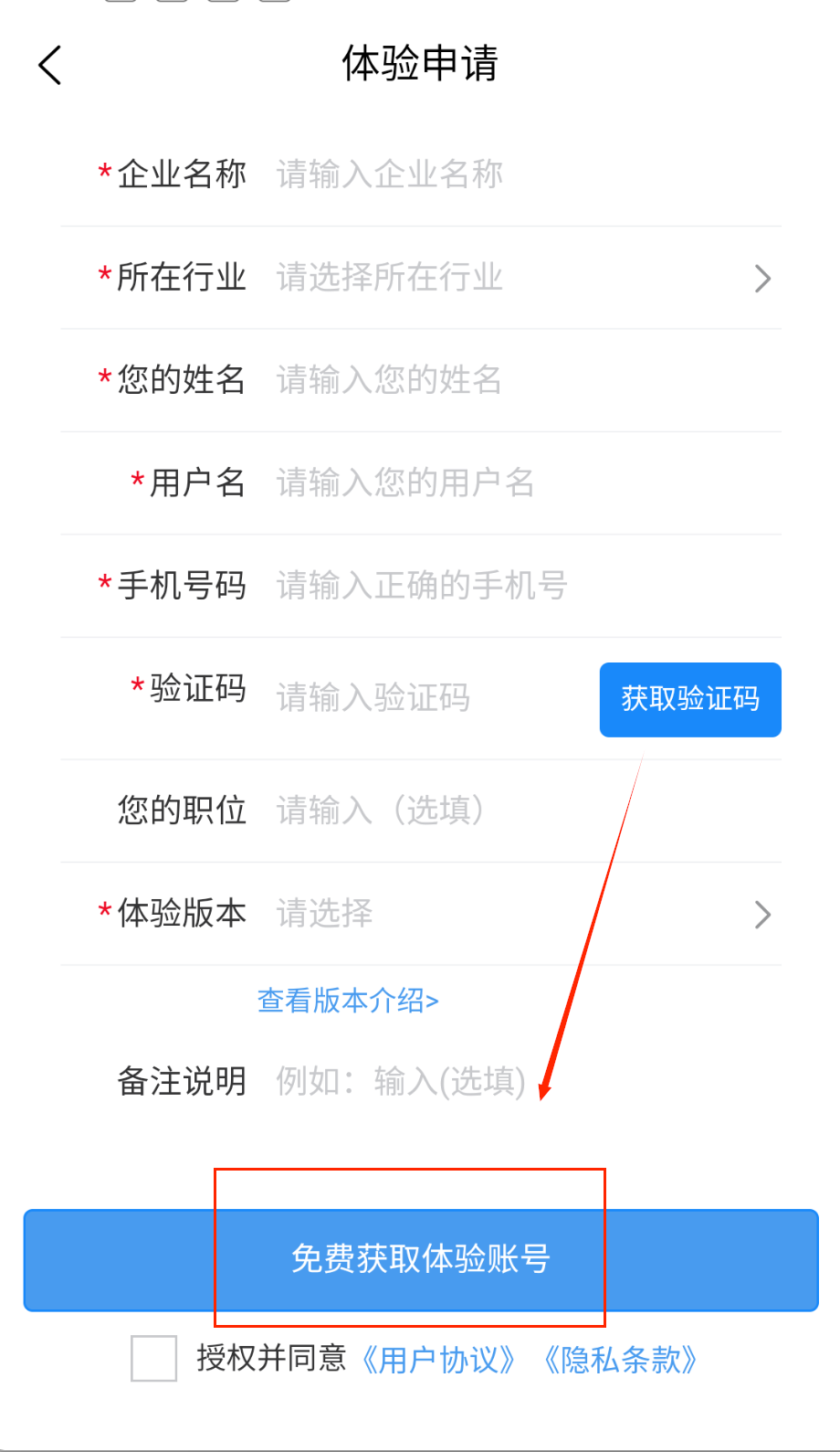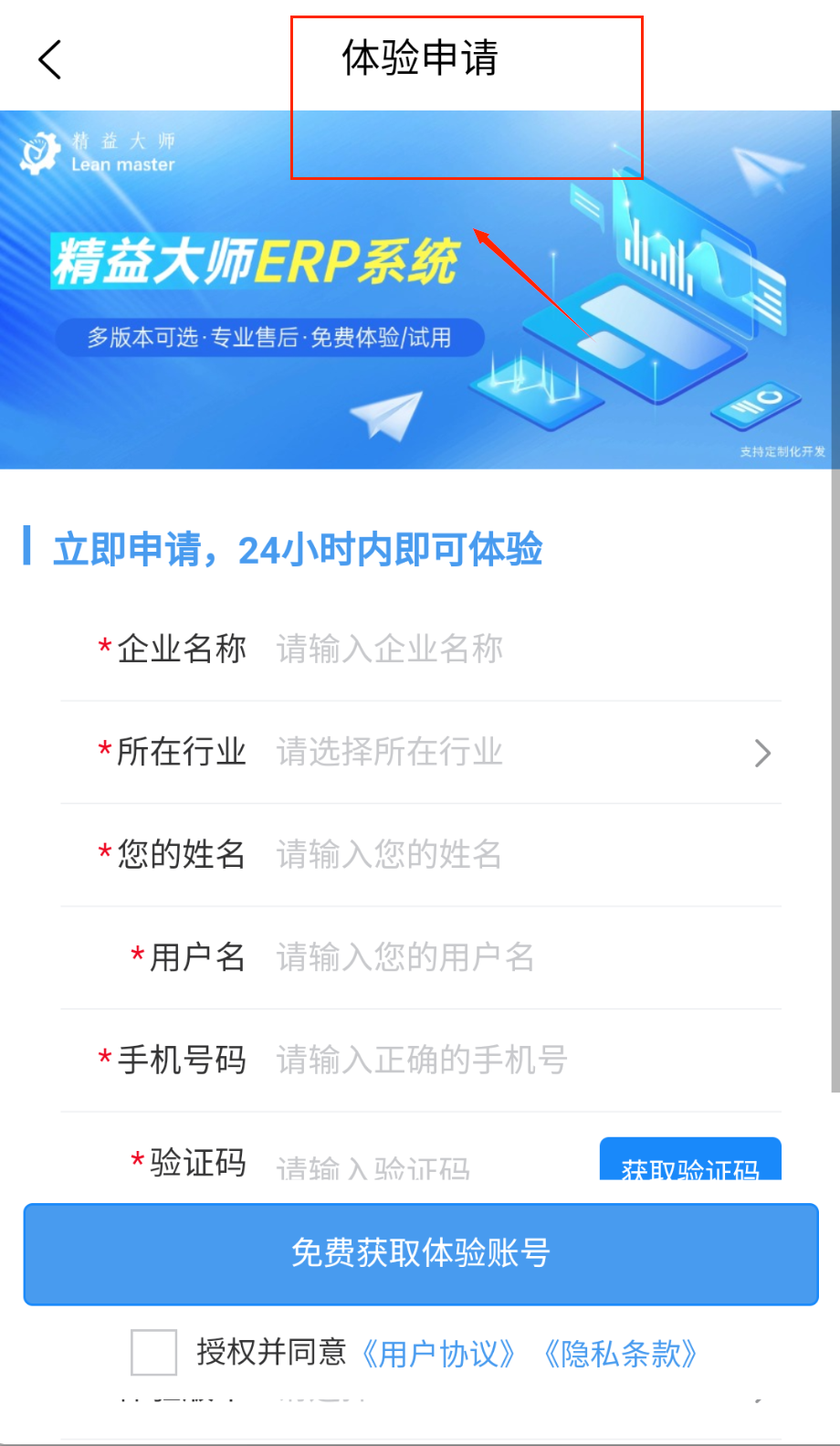2、在白色表单区域依次填写企业名称、行业类型、联系人姓名和手机号,注意带星号的是必填项啦。