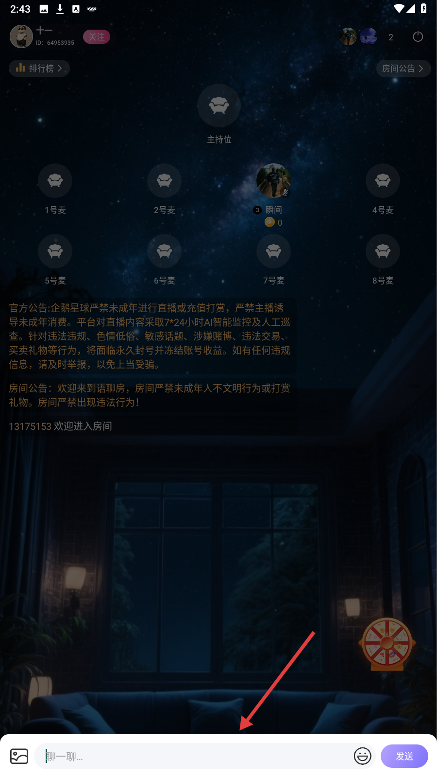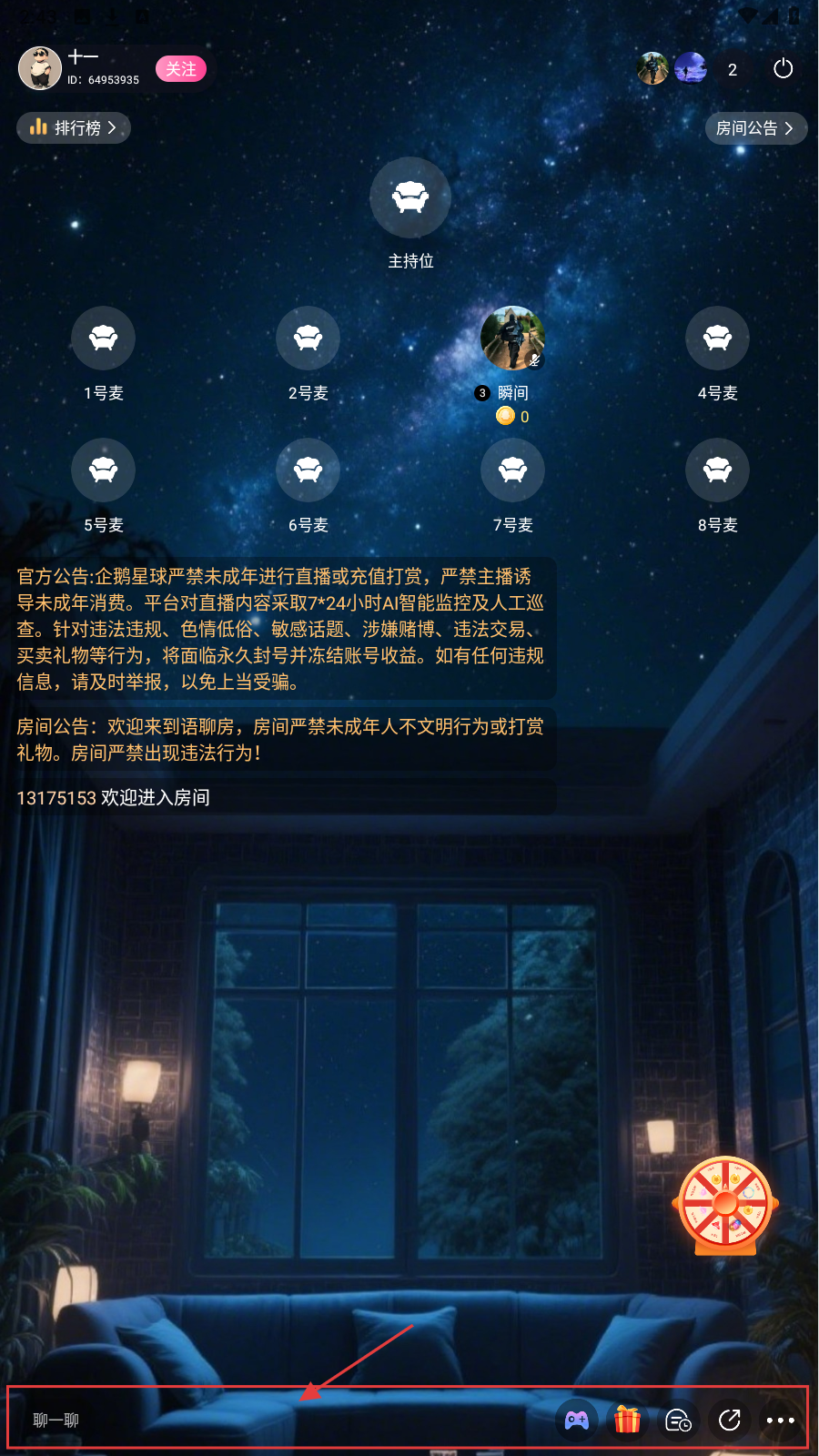 2、在房间内,点击底部【聊一聊】输入框。