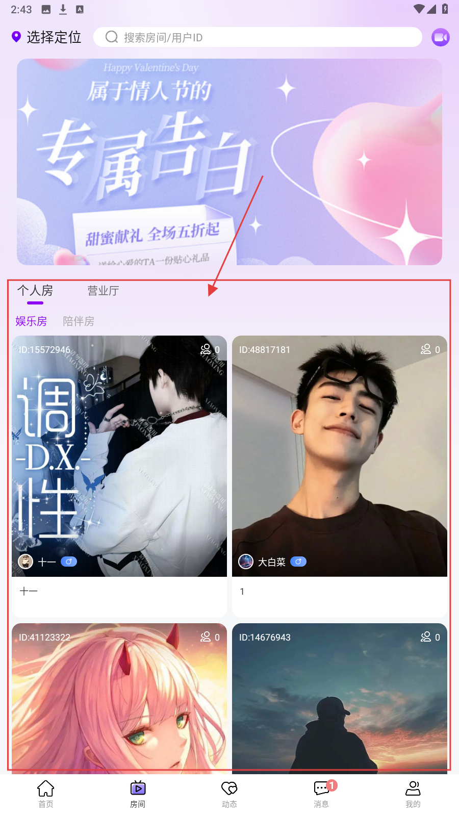1、进入【房间】页,选感兴趣【个人房-娱乐房】,点击进入房间互动。