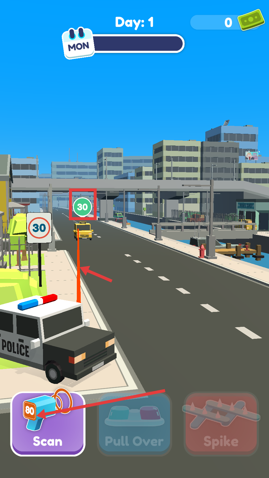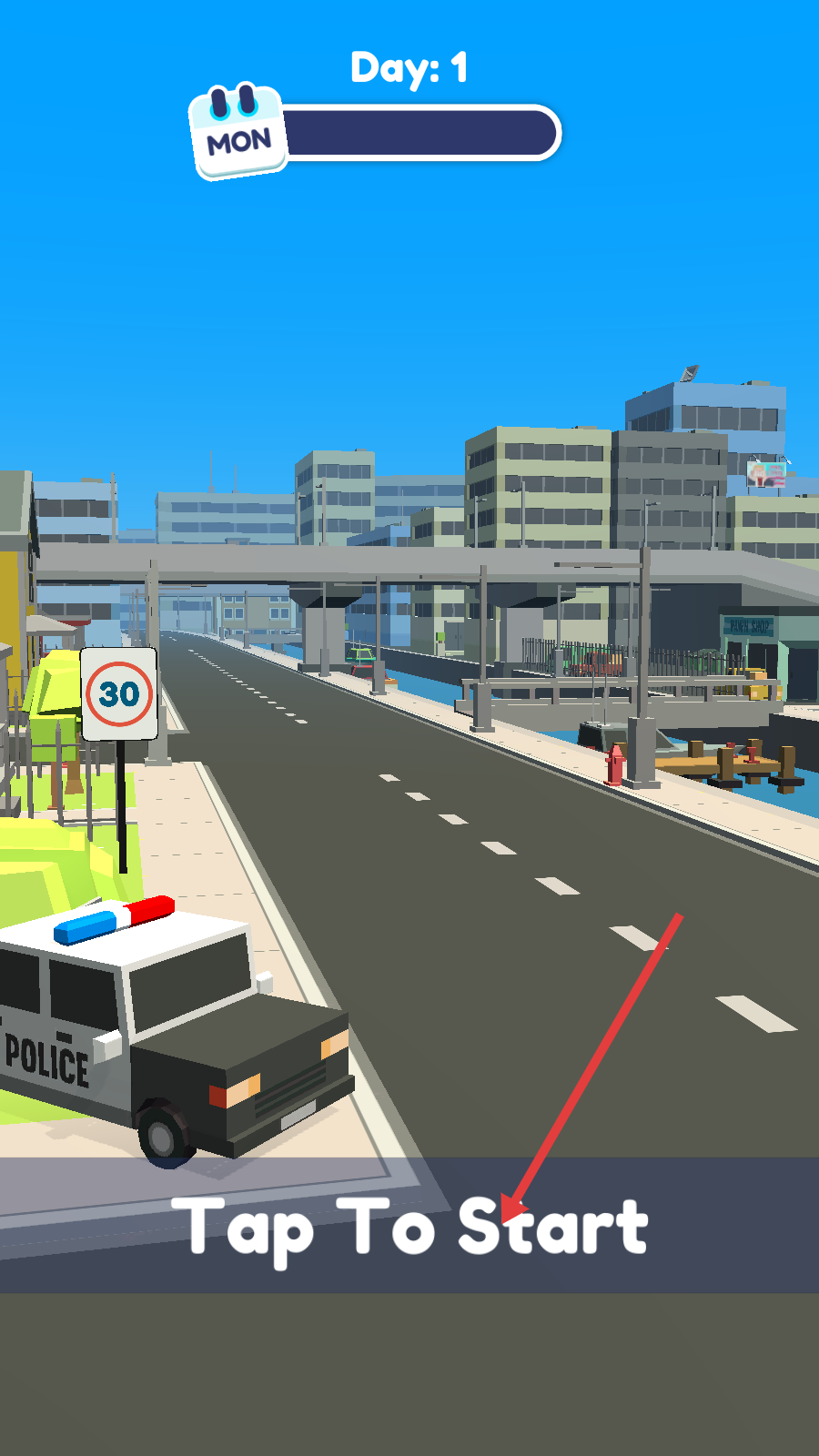 1、进入游戏点击【Tap-To-Start】,开启【Day-1】-【MON】的警察执法任务,准备开展道路巡逻工作。