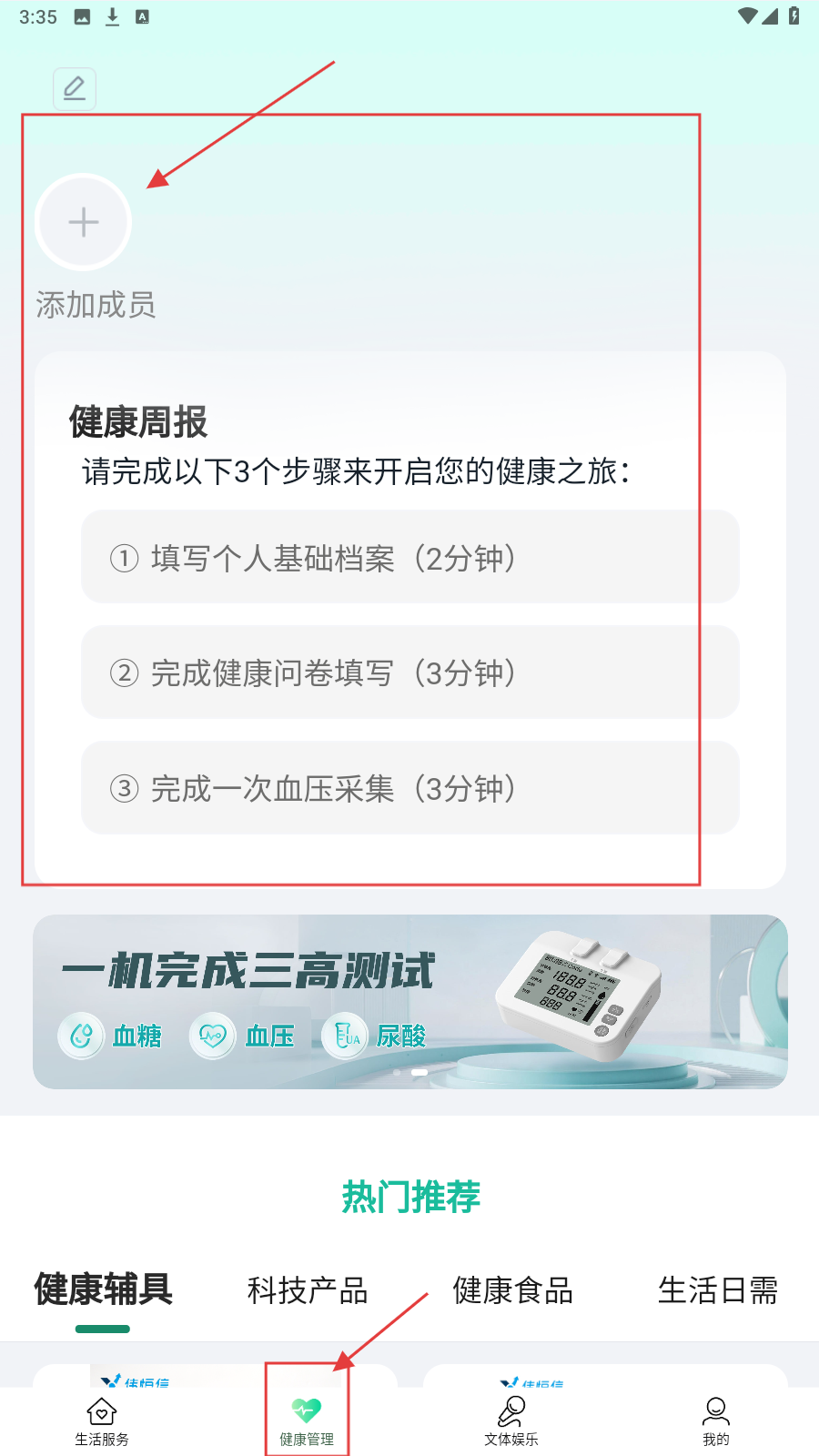 4、切换到【健康管理】页,点【 】添加成员,按指引完成健康周报。