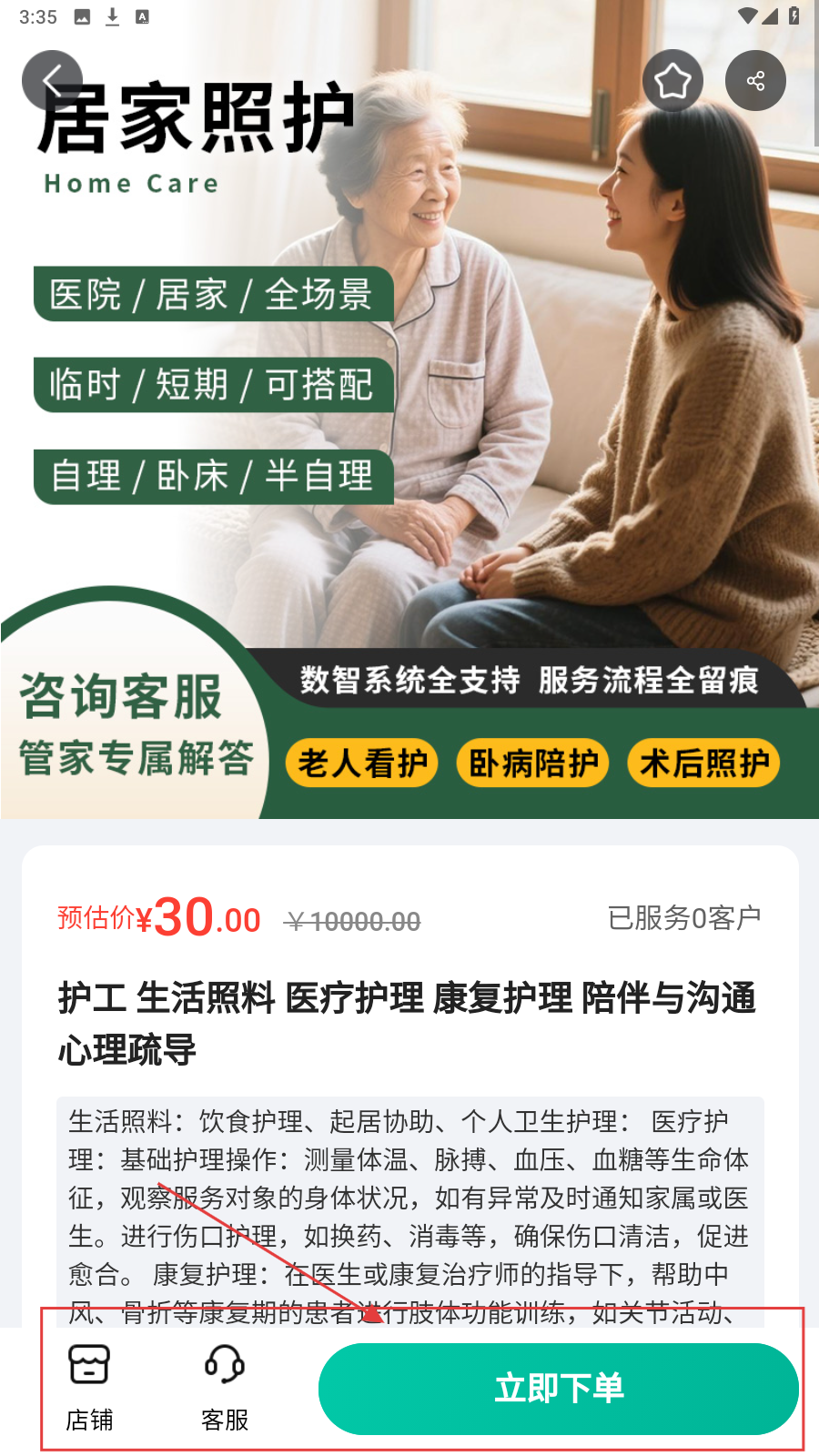 3、进入【居家照护】详情,确认服务内容后,点【立即下单】。