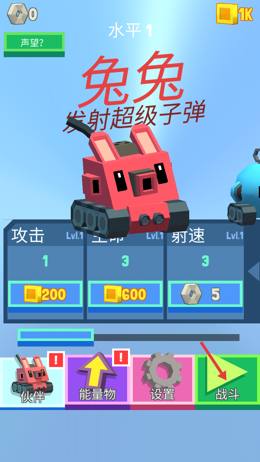 1、在【兔兔-发射超级子弹】界面,优先升级【攻击-Lvl.1】等属性,积累资源后点击【战斗】按钮开启关卡。