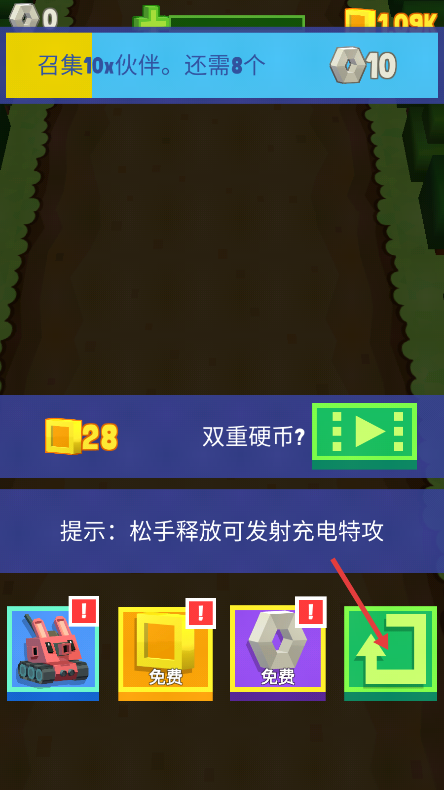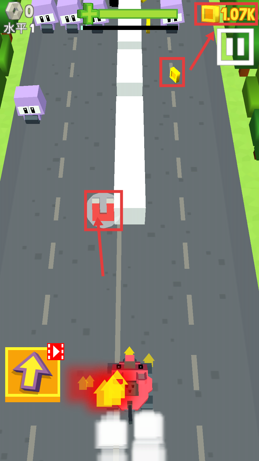 3、战斗中留意黄色方块金币,同时拾取红色箭头指向的道具,助力提升兔兔车的战斗续航能力。