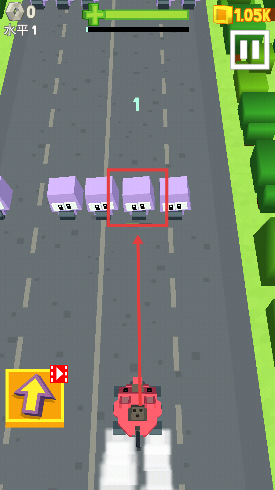 2、战斗时操控兔兔车瞄准紫色方块敌人,利用【发射超级子弹】机制击溃敌人,推进【水平1】进度。