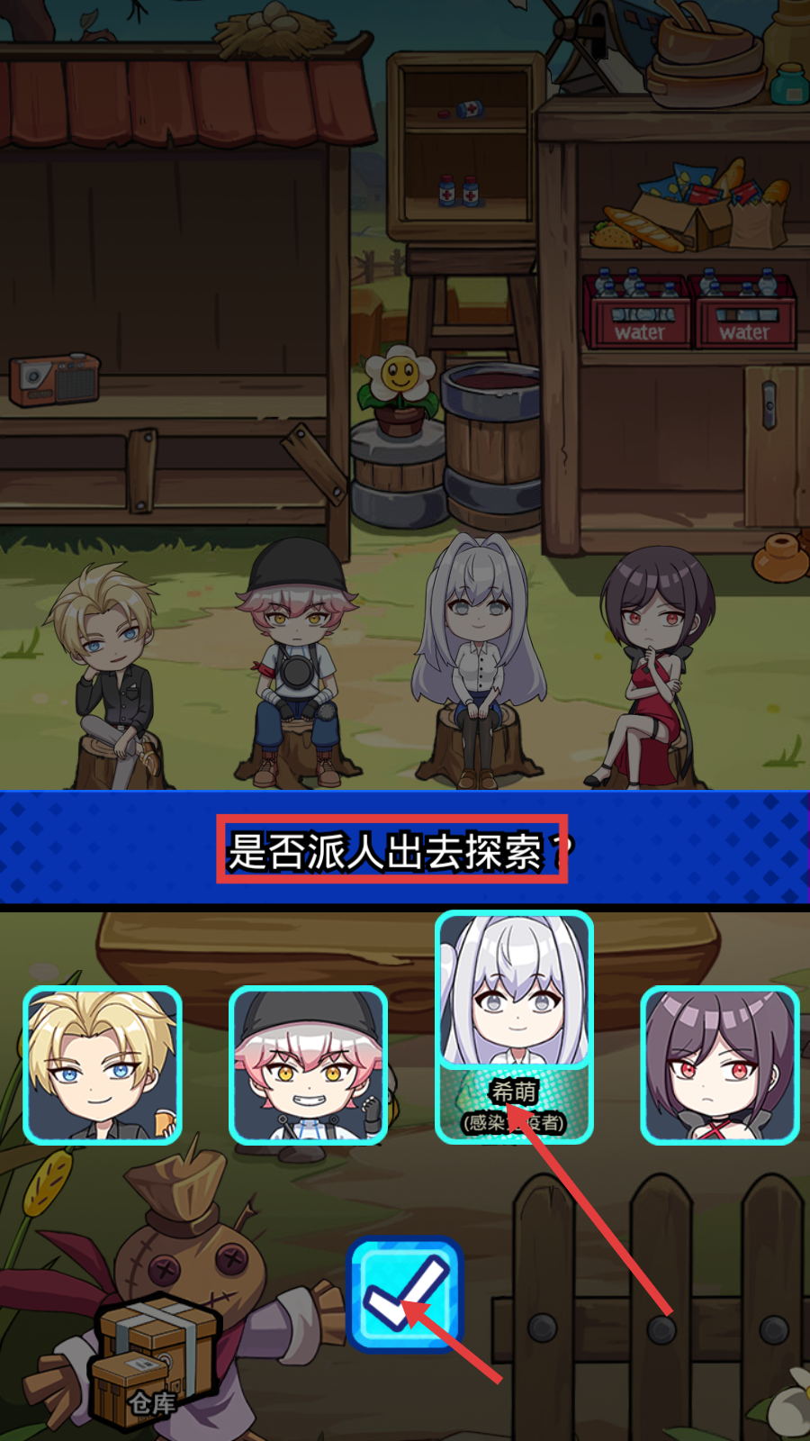 2、面对【是否派人出去探索】选择,派【希萌-感染免疫者】外出,点击确认开启探索旅程。