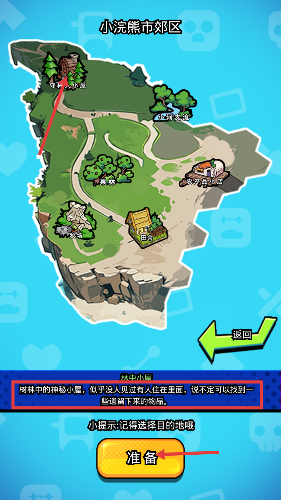 3、在【小浣熊市郊区】选【守林人小屋】,其为神秘地点或藏遗留物品,点击【准备】出发探索。