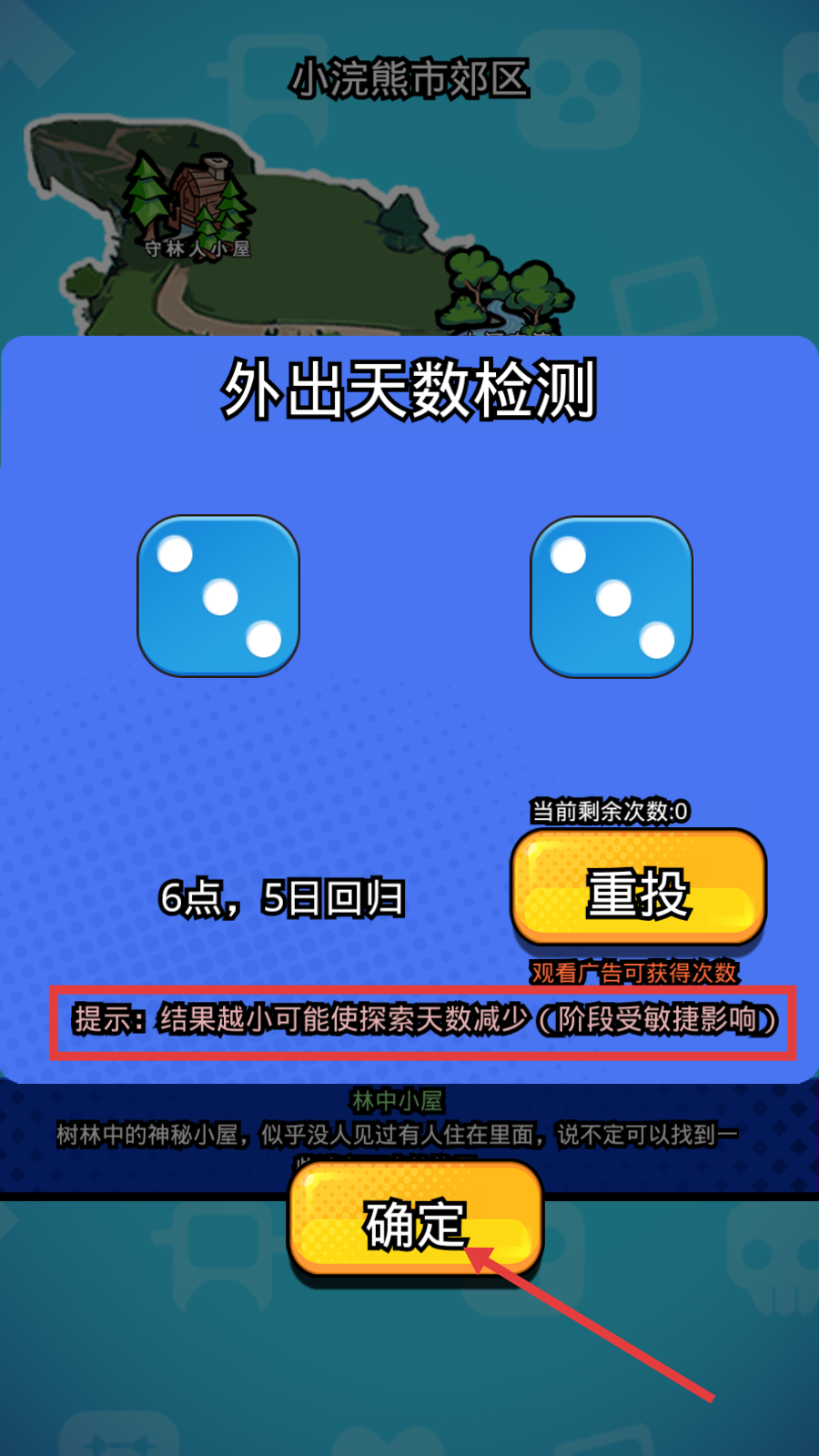 4、外出天数检测掷出【6点-5日回归】,留意提示【结果越小可能使探索天数减少-阶段受敏捷影响】,点击确定。