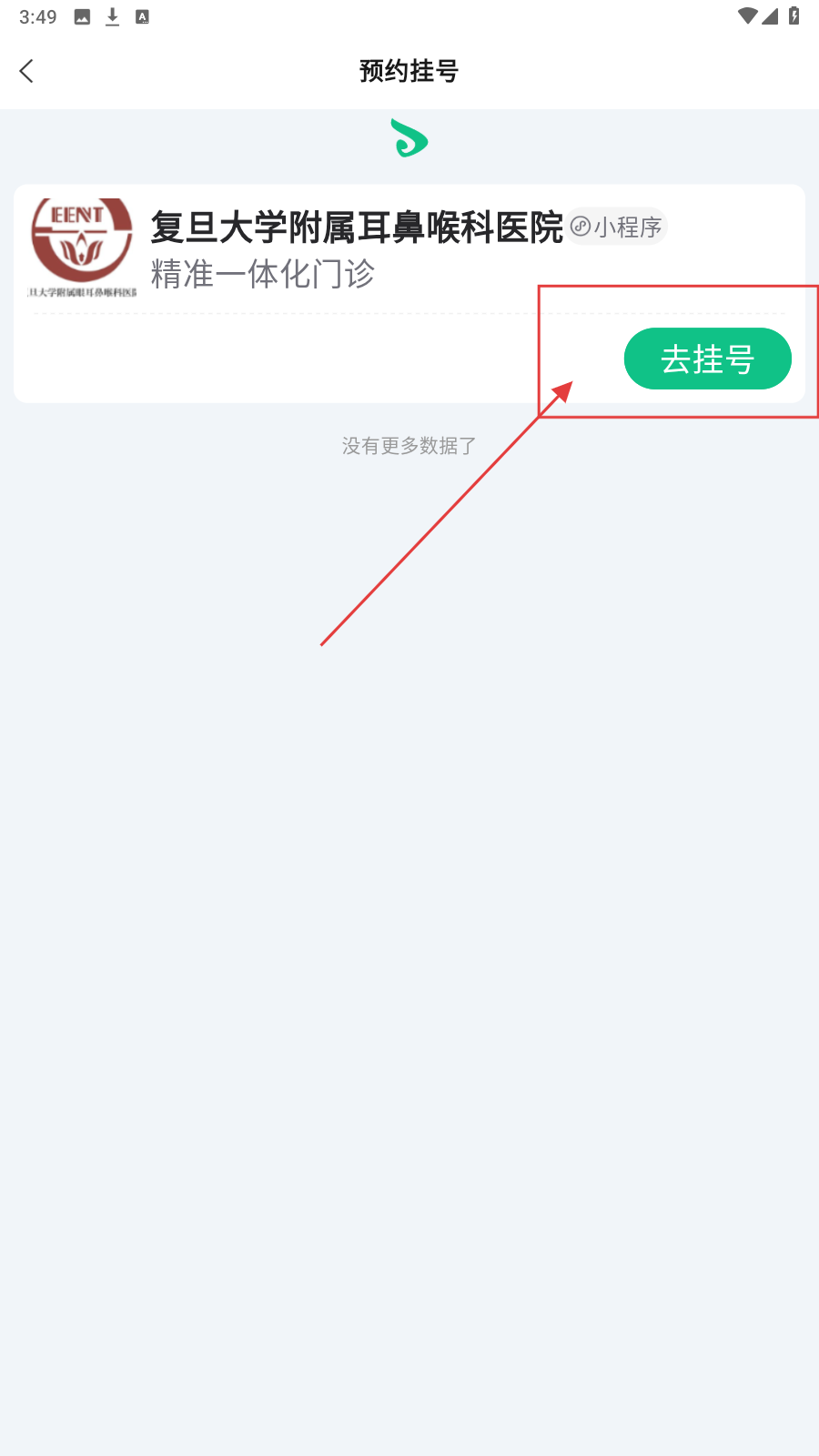 4、需就医时,进预约挂号页,点【去挂号】,跳转小程序挂号,预约看诊。
