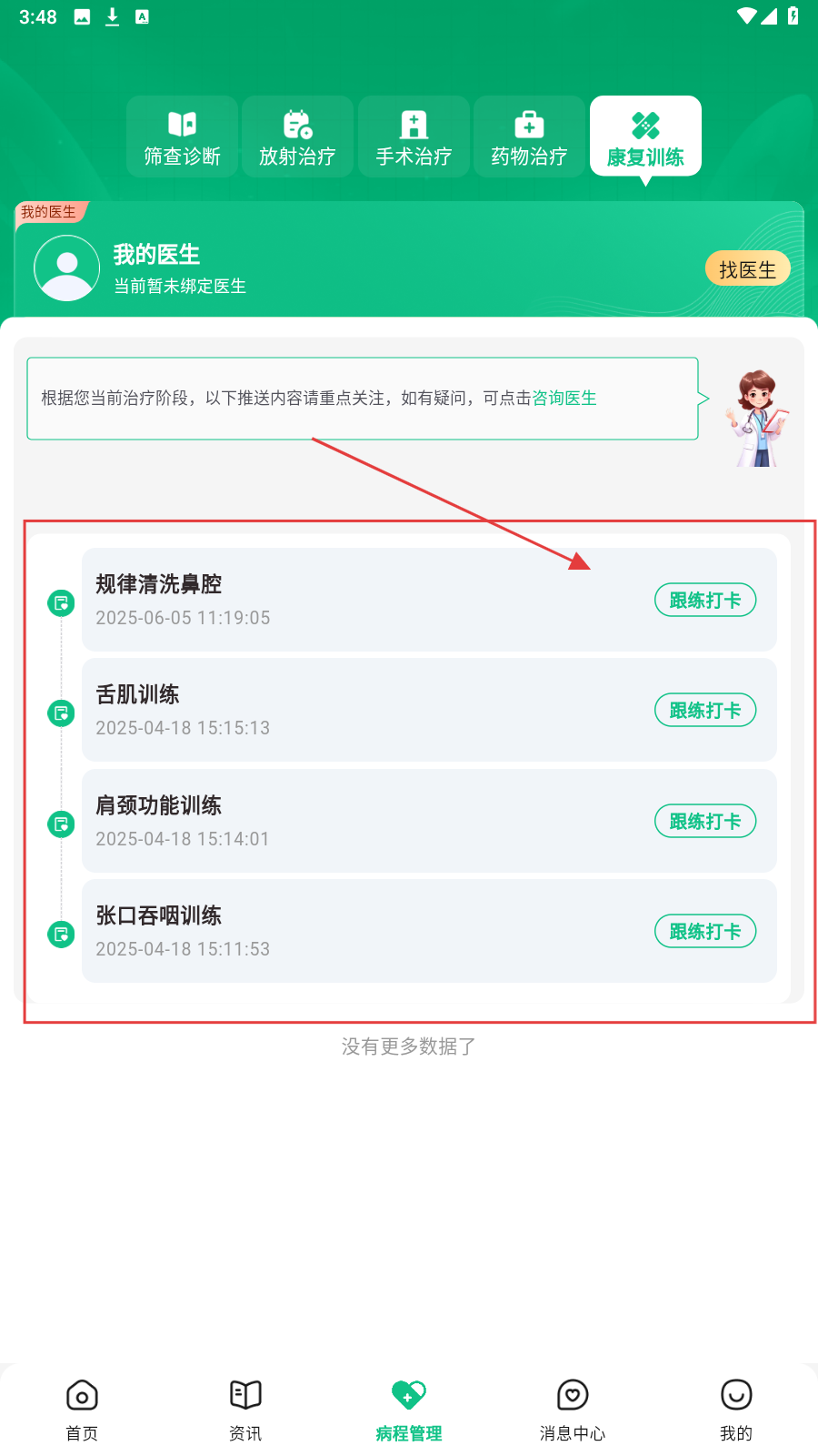 1、首页点【康复训练】,进入康复训练页面,查看专属训练任务。