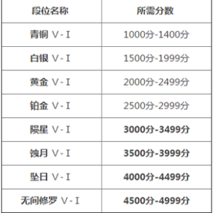 2500分到2999分,分为铂金1到铂金5五个小段位。