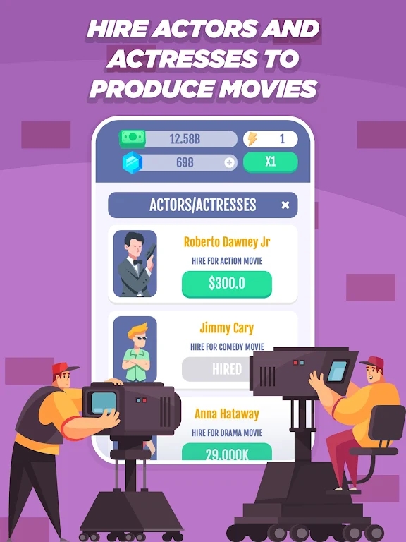 《空闲电影工作室》是一款非常好玩的模拟经营类游戏,玩家是要去找到更多的演员去进行拍电影的,这样是会将自己的工作室的名声给提高而且还会有很好的收益哦。玩家也是可以将自己的工作室给一步步的进行提高的,这样就会有很多的演员来我们这拍电影的哦会很不错的。