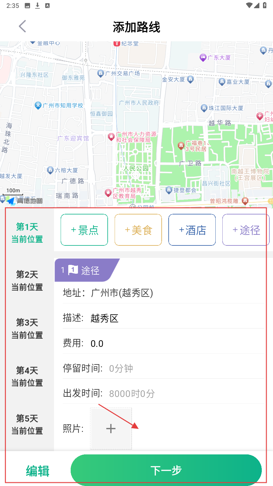 4、用添加路线功能,按天添加景点、美食等,自定义专属旅行路线,点【下一步】推进。