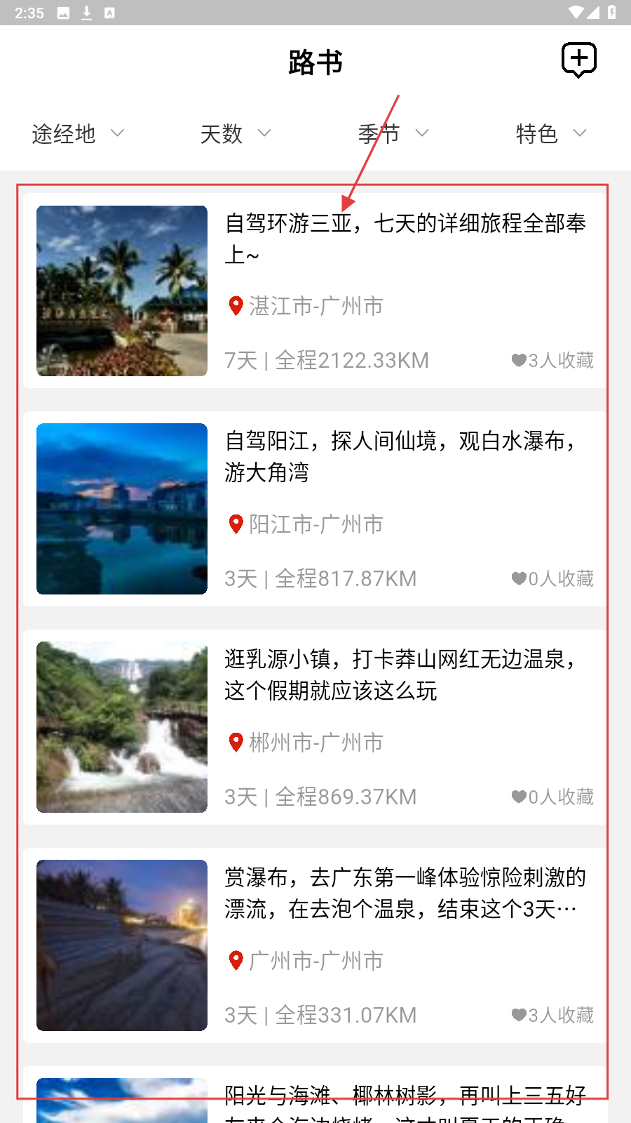 2、在路书列表,按天数选行程,如【自驾环游三亚-7天】,查看详细旅程规划。