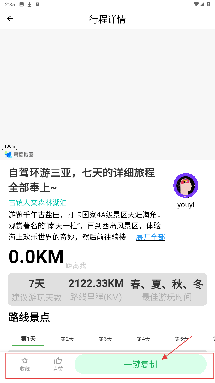 3、进入行程详情,点【一键复制】,快速保存三亚7天自驾行程,方便规划。