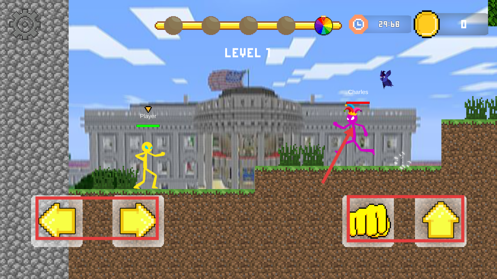 2、战斗时操控左侧【方向键】移动,点击右侧【攻击按钮】或【跳跃按钮】,灵活应对紫色敌人【Charles】,抢占战斗优势。