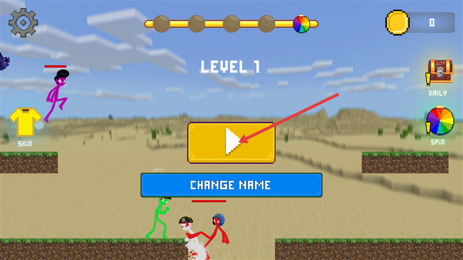 1、处于【LEVEL-1】界面,点击黄色【播放按钮】进入关卡,可先在【CHANGE-NAME】或【SKIN】界面调整设置,为战斗做好准备。